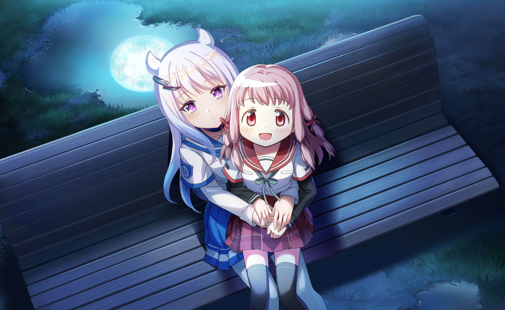 2girls artist_request beads black_sleeves black_thighhighs blue_bow blue_bowtie blue_sailor_collar blue_skirt bow bowtie breast_pocket closed_mouth collarbone colored_tips dot_nose eternal_sakura expressionless eyelashes feet_out_of_frame from_above full_moon game_cg grass hair_beads hair_bow hair_horns hair_ornament hairclip hand_on_another's_hand happy high-waist_skirt highres hug kamihama_university_affiliated_school_uniform layered_sleeves light_blush long_hair long_sleeves looking_at_viewer magia_record:_mahou_shoujo_madoka_magica_gaiden mahou_shoujo_madoka_magica mahou_shoujo_madoka_magica_magia_exedra minaminagi_liberty_academy_school_uniform miniskirt moon multicolored_hair multiple_girls official_art on_bench open_mouth pantyhose pink_bow pink_eyes pink_hair plaid_clothes plaid_skirt pleated_skirt pocket puddle purple_eyes red_sailor_collar red_skirt reflection reflective_liquid sailor_collar school_uniform shirt short_over_long_sleeves short_sleeves sitting sitting_on_lap sitting_on_person skirt smile tamaki_ui tareme thighhighs very_long_hair white_hair white_pantyhose white_shirt zettai_ryouiki