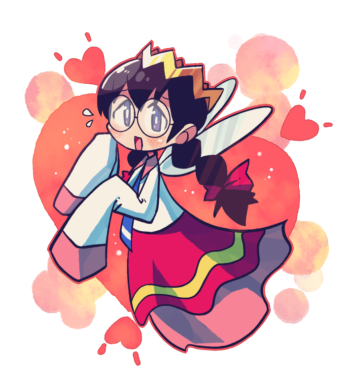 1girl black_hair blush bow braid fairy fairy_wings flying_sweatdrops hair_bow heart kirby_(series) kirby_64 long_hair looking_at_viewer low_twin_braids nintendo rariatto_(ganguri) red_bow ripple_star_queen skirt sleeves_past_fingers sleeves_past_wrists smile twin_braids wings