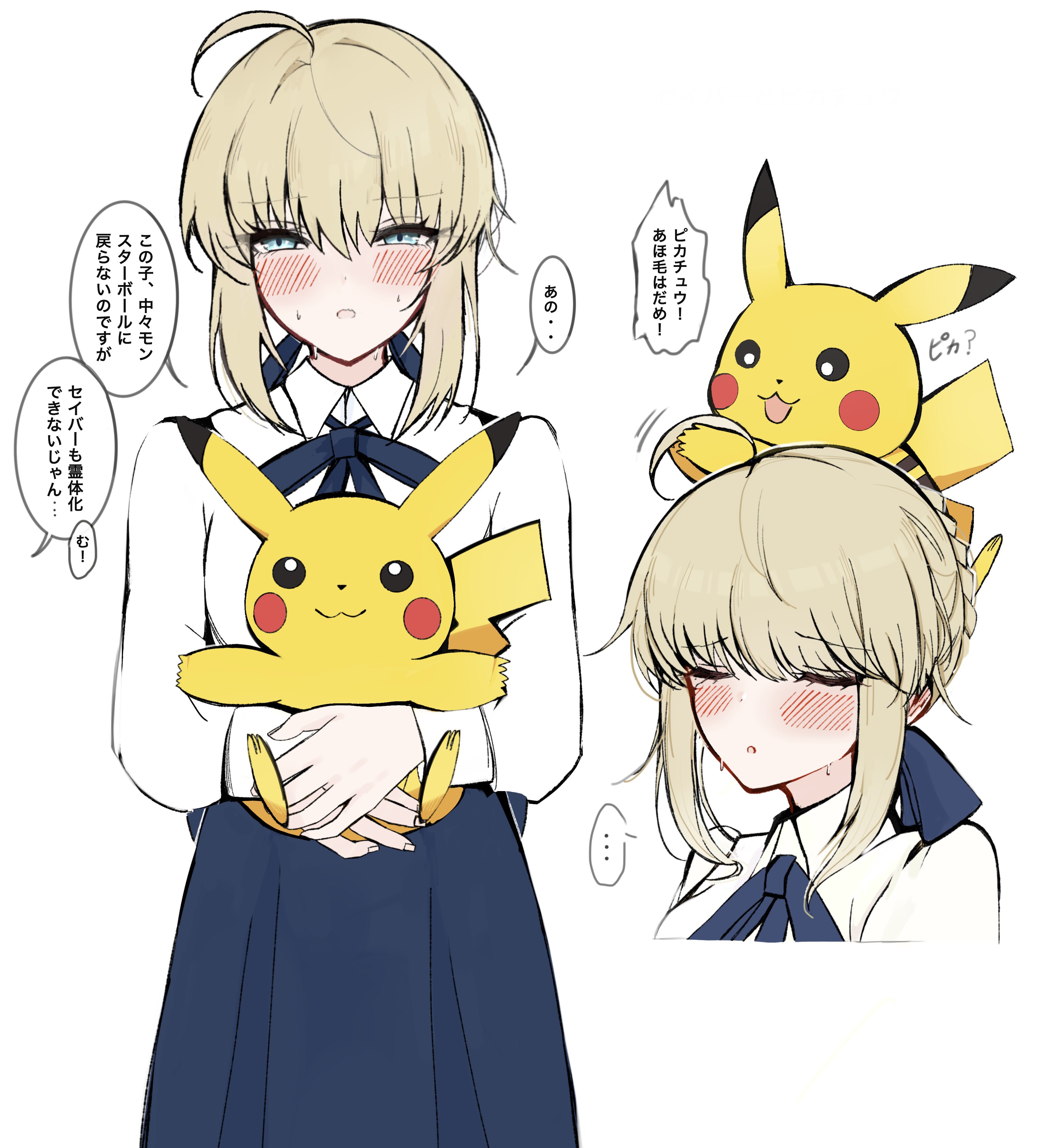 1boy 1girl absurdres ahoge artoria_pendragon_(fate) blonde_hair blouse blush closed_eyes crossover fate/stay_night fate_(series) gen_1_pokemon grabbing_another's_hair green_eyes hair_ribbon hayato_hoshi604 highres holding holding_another's_hair holding_pokemon japanese_text long_skirt looking_at_viewer nintendo on_head pikachu pokemon pokemon_(creature) pokemon_on_head ribbon saber_(fate) shirt simple_background skirt speech_bubble translation_request white_background