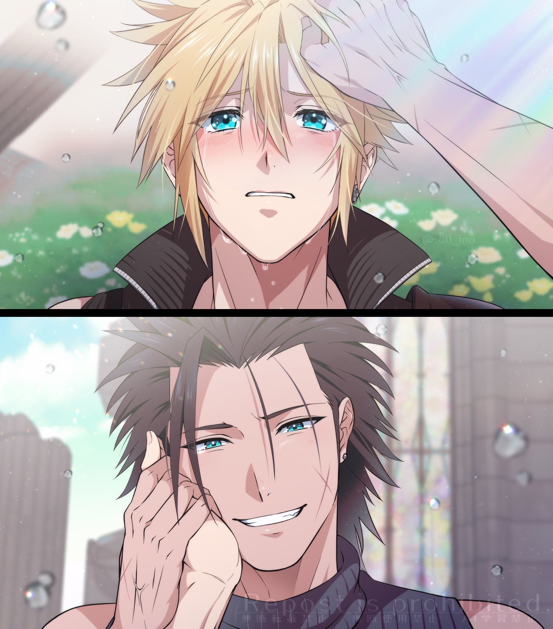 2boys armor black_hair blonde_hair blue_eyes blue_sky cloud_strife cross_scar crying earrings facial_scar final_fantasy final_fantasy_vii hair_slicked_back highres implied_yaoi jewelry long_hair male_focus multiple_boys scar scar_on_cheek scar_on_face sd0_ino shirt short_hair shoulder_armor sky sleeveless sleeveless_turtleneck smile spiked_hair turtleneck wet_lens zack_fair