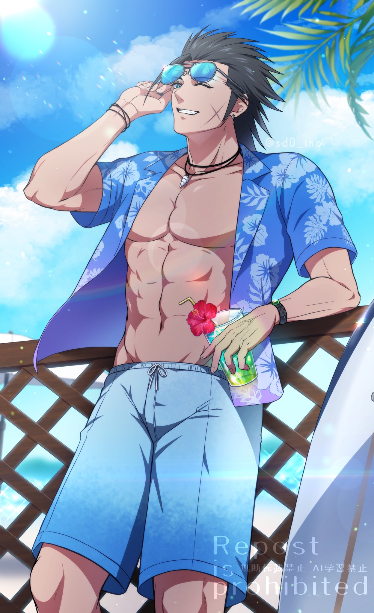 1boy abs aviator_sunglasses beach black_hair blue_eyes blue_sky bracelet cloud cross_scar drinking_straw facial_scar final_fantasy final_fantasy_vii flower hair_slicked_back hawaiian_shirt hibiscus highres jewelry long_hair necklace ocean open_clothes open_shirt scar scar_on_cheek scar_on_face sd0_ino shirt shorts sky smile spiked_hair sunglasses tropical_drink zack_fair