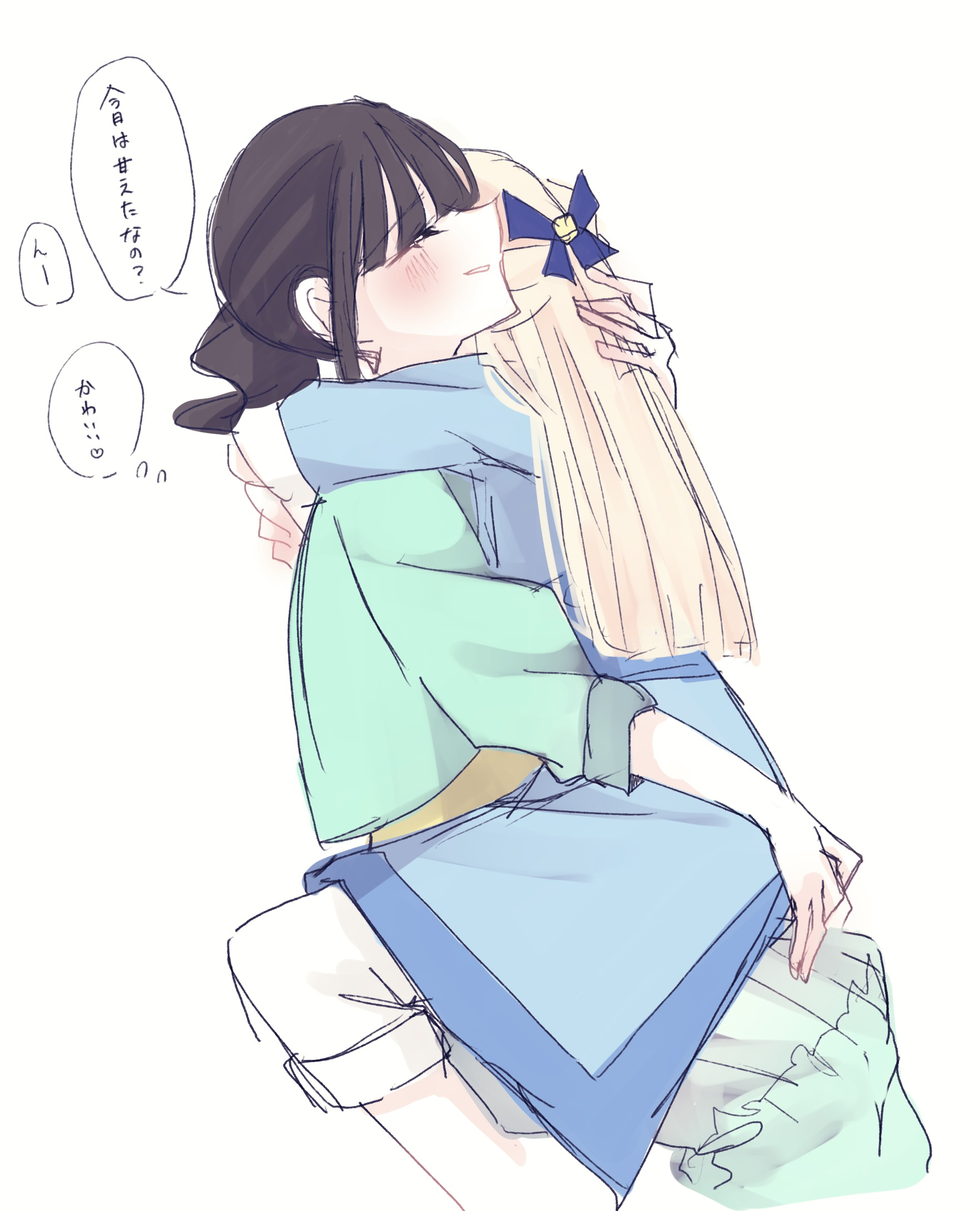 2girls arms_around_neck blonde_hair blue_dress blue_jacket blush brown_hair closed_eyes commentary_request dress highres hug jacket long_hair multiple_girls nekoyashiki_mayu nekoyashiki_yuki parted_lips precure rita_(myyk_rrnyam) side_ponytail simple_background sitting sitting_on_lap sitting_on_person speech_bubble thought_bubble translation_request white_background wonderful_precure! yuri