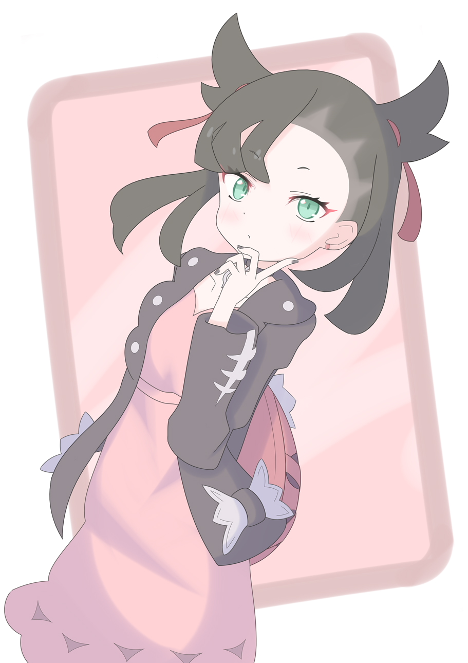 1girl asymmetrical_bangs backpack bag black_choker black_hair black_jacket black_nails choker dress green_eyes hair_ribbon hand_up highres jacket marnie_(pokemon) nintendo pink_dress pokemon pokemon_sword_and_shield red_ribbon ribbon shisa-tsukishima solo twintails