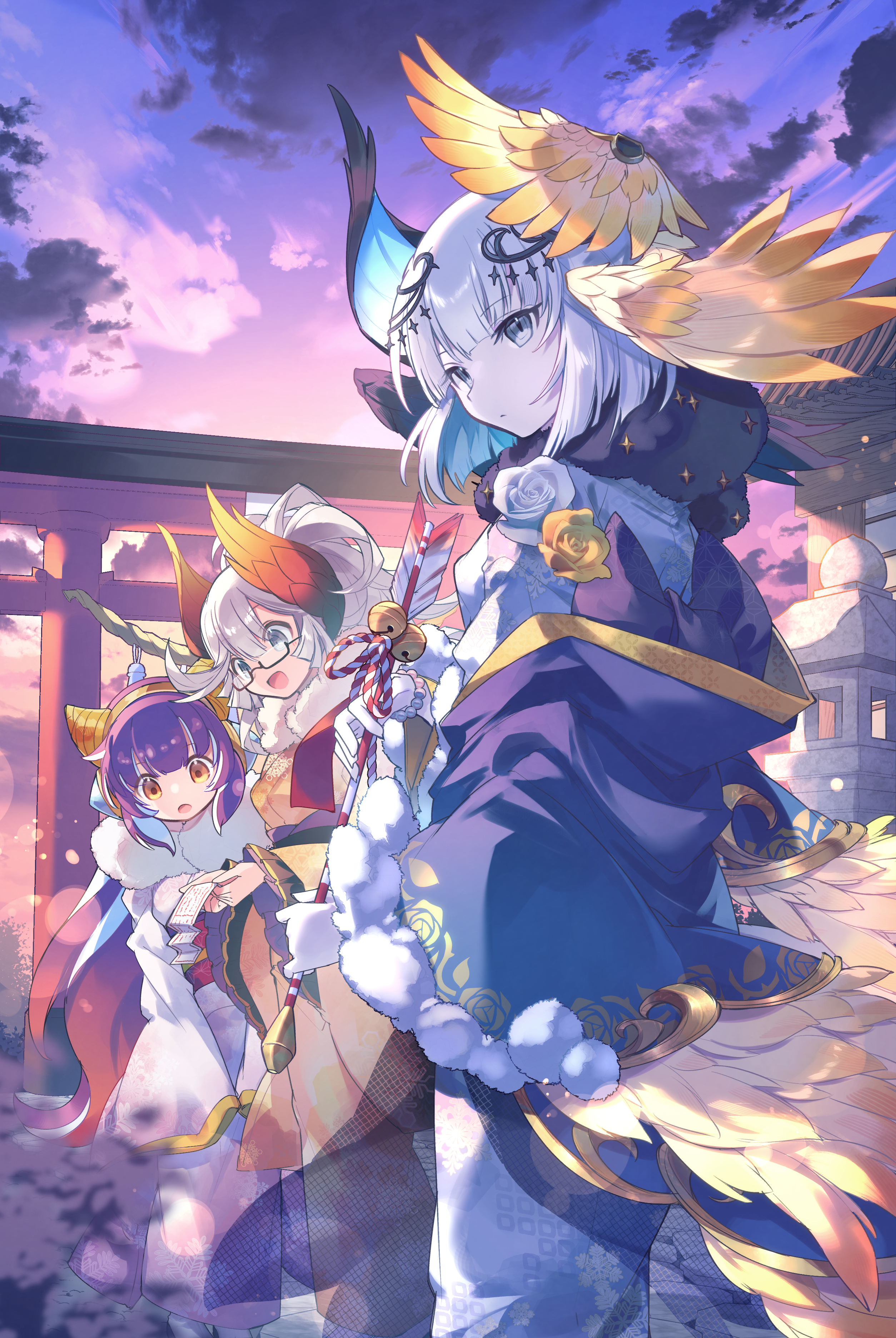3girls absurdres blue_eyes blue_kimono feathers flower fur_trim glasses grey_hair grey_wings hair_ornament head_wings highres horns japanese_clothes kimono kuuron_(moesann17) long_hair multicolored_hair multiple_girls orange_wings orya_(p&d) ponno_(p&d) purple_hair puzzle_&_dragons reeche_(p&d) short_hair smile sunset temple two-tone_hair very_long_hair white_hair white_kimono wings yellow_eyes