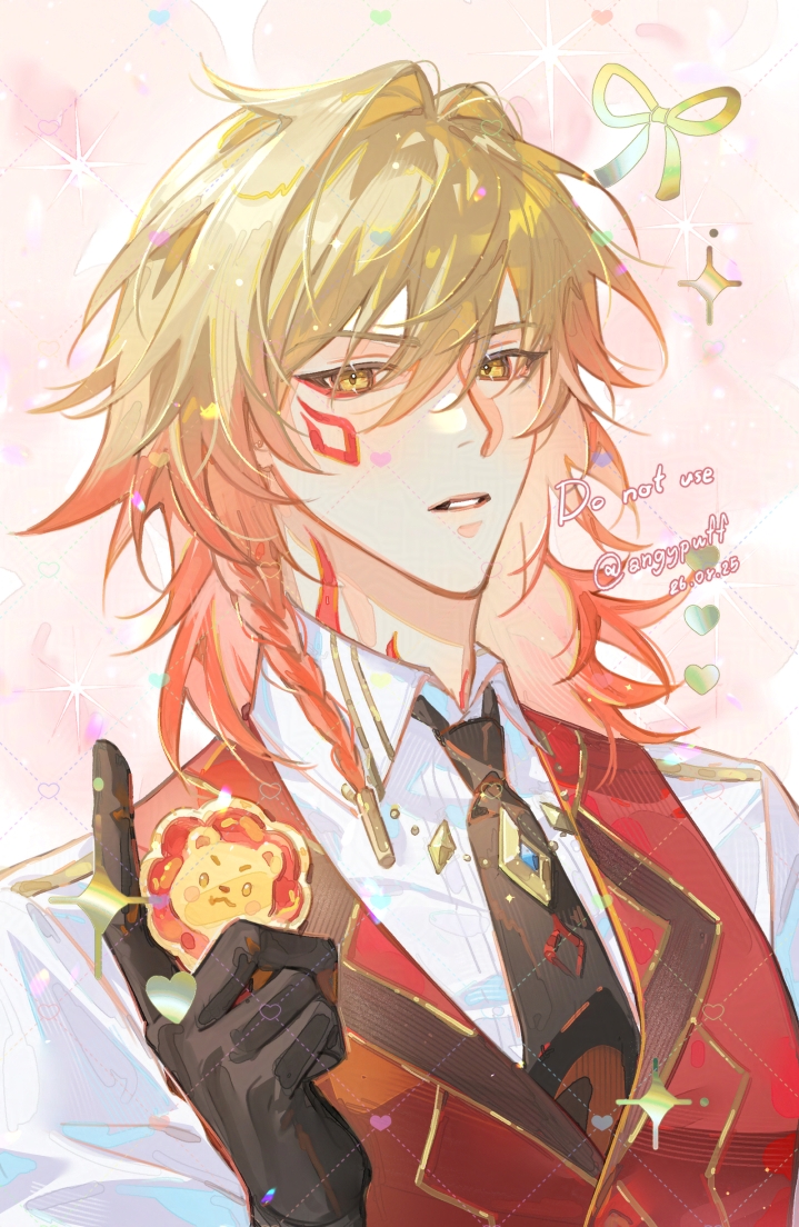 1boy alternate_costume angypuff black_gloves black_necktie blonde_hair braid collared_shirt commentary facial_tattoo gloves gradient_hair hair_between_eyes honkai:_star_rail honkai_(series) male_focus medium_hair multicolored_hair mydei_(honkai:_star_rail) necktie parted_lips red_hair red_tattoo red_vest shirt side_braid solo tattoo twitter_username vest watermark white_shirt yellow_eyes
