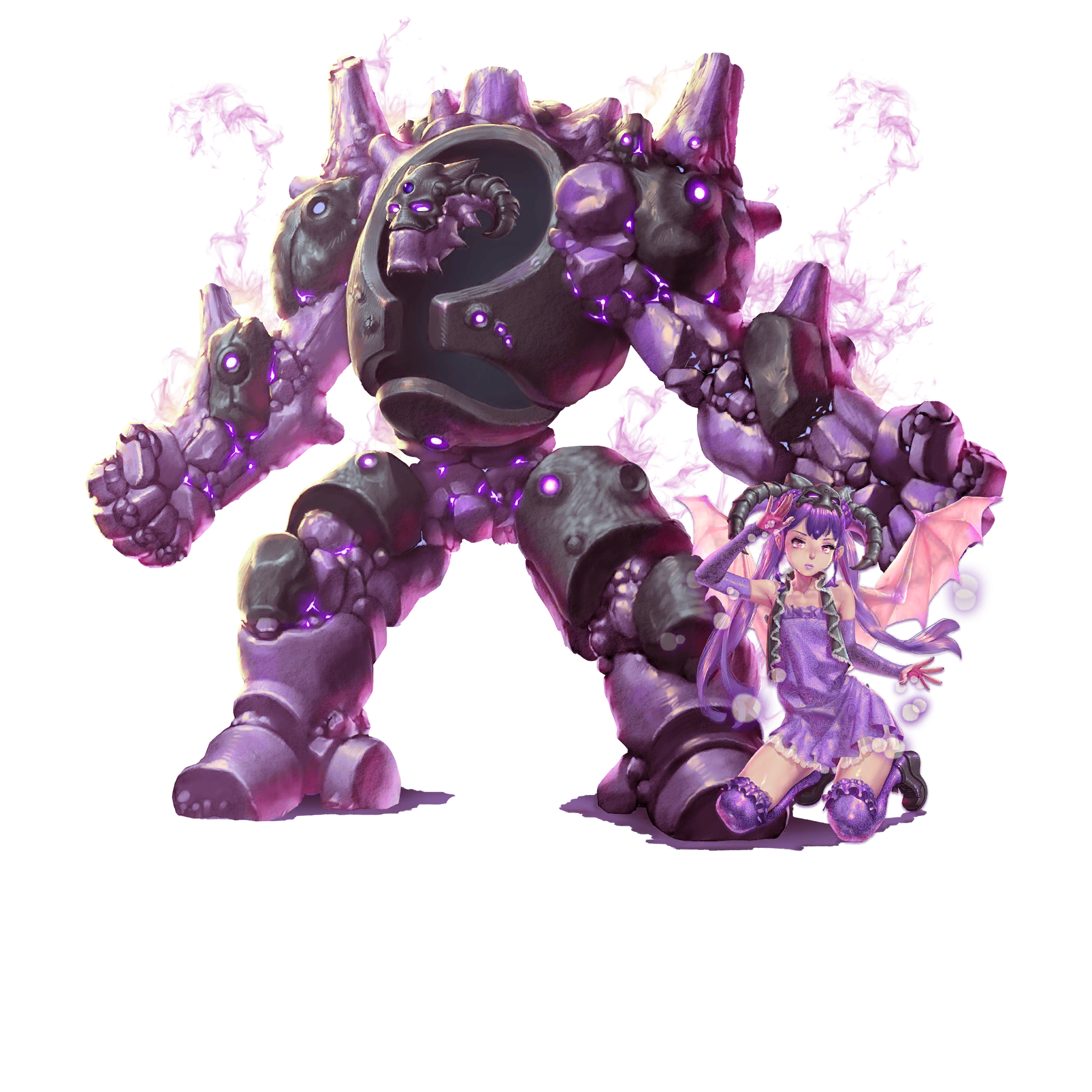 1girl 1other abyss_(crystal_maidens) amethyst_(crystal_maidens) artist_request bad_source bare_shoulders crystal_maiden_(series) demon_wings detached_sleeves flat_chest frills full_body game_cg golem highres kneeling official_art pink_eyes purple_hair purple_lips solo transparent_background twintails variant_set wings