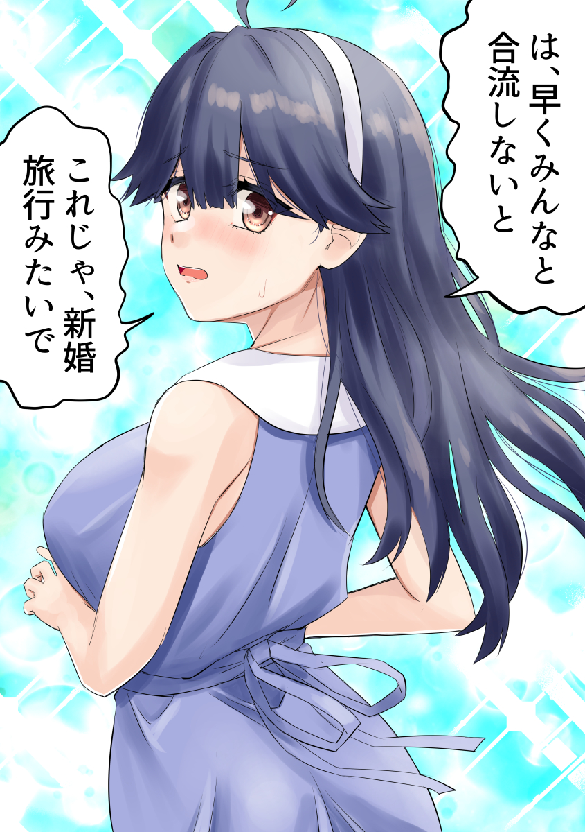 1girl ahoge black_hair blue_background brown_hair casual commentary_request cowboy_shot dress from_behind hairband highres kantai_collection long_hair looking_at_viewer looking_back nekotarou_(nktr299) official_alternate_costume purple_dress sleeveless sleeveless_dress solo ushio_(kancolle) ushio_(kure)_(kancolle) ushio_kai_ni_(kancolle) white_hairband