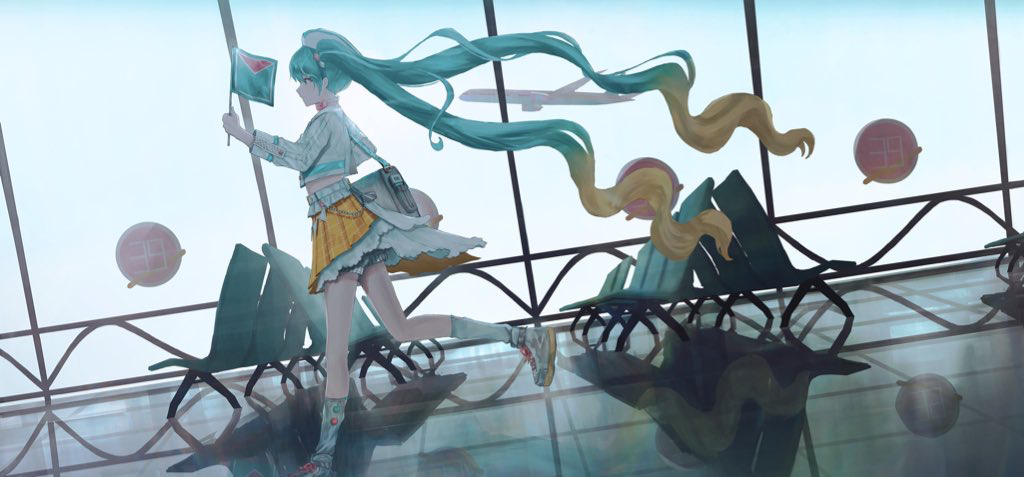1girl 39 airport aqua_eyes aqua_hair bag beret blonde_hair cropped_jacket flag from_side gradient_hair hat hatsune_miku holding holding_flag jacket kogumo_kei long_hair magical_mirai_(vocaloid) magical_mirai_miku magical_mirai_miku_(2024) midriff multicolored_hair official_alternate_costume official_alternate_hairstyle pleated_skirt running shoes shorts shorts_under_skirt shoulder_bag skirt solo travel twintails very_long_hair vocaloid white_hat white_jacket white_shoes white_shorts yellow_skirt