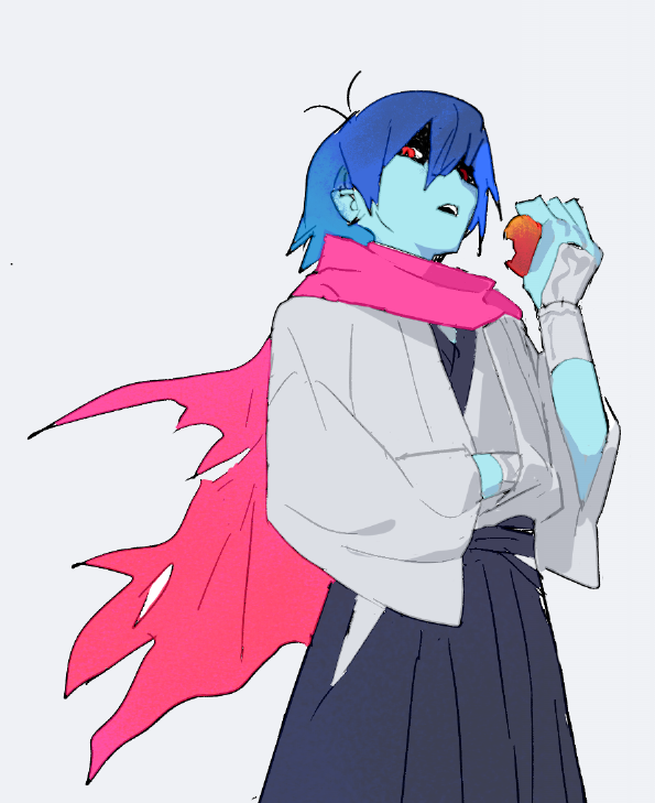 1other adapted_costume androgynous antenna_hair apple black_hakama blue_hair blue_skin bracer colored_skin cowboy_shot deltarune eating expressionless food food_bite fruit greenheart grey_background grey_jacket hair_between_eyes hakama hand_in_clothes haori holding holding_food holding_fruit jacket japanese_clothes kimono kris_(dark_world)_(deltarune) kris_(deltarune) long_sleeves looking_at_viewer open_mouth other_focus red_eyes red_scarf scarf shaded_face short_hair simple_background solo standing teeth torn_clothes torn_scarf upper_teeth_only utdr_(toby_fox) white_kimono wide_sleeves