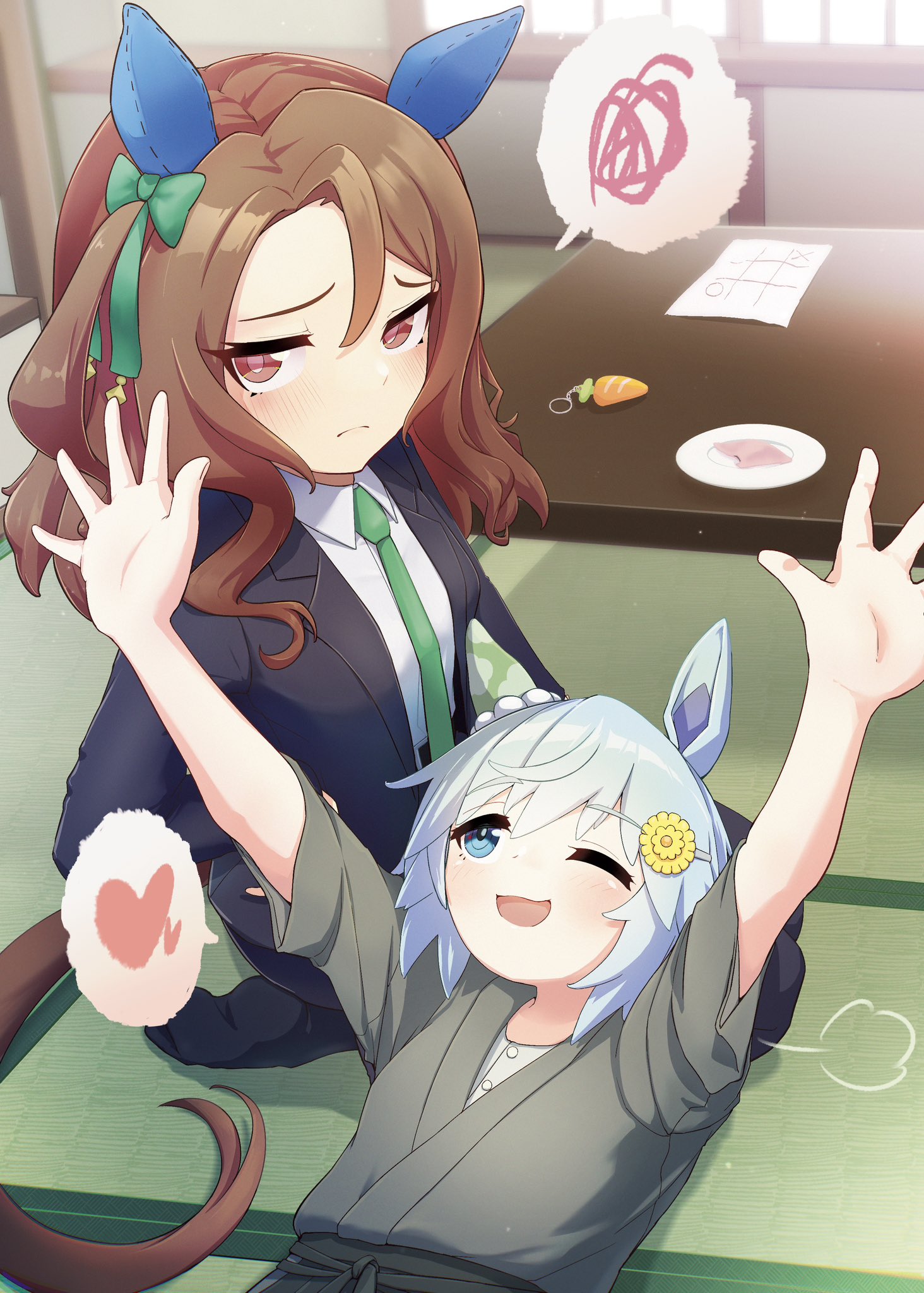 2girls animal_ears annoyed azuki1matcha blue_eyes blush bow breasts brown_hair closed_mouth ear_bow ear_covers ear_ribbon flower formal_clothes frown green_bow green_kimono green_necktie grey_hair hair_between_eyes hair_flower hair_ornament hairclip happy heart highres horse_ears horse_girl horse_tail indoors japan japanese_clothes kimono king_halo_(umamusume) lap_pillow long_hair multiple_girls necktie one_eye_closed open_mouth pants red_eyes seiun_sky_(umamusume) seiza shirt short_hair short_sleeves single_ear_cover sitting smile socks suit sunflower sunflower_hair_ornament table tail umamusume white_shirt yukata
