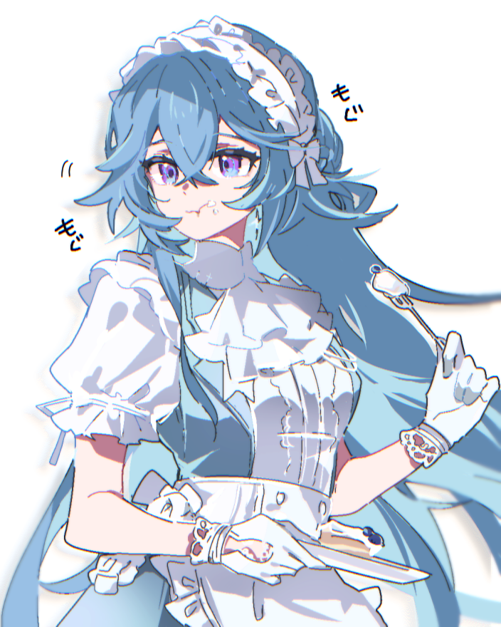 apron aqua_dress aqua_hair cake cake_slice crossed_bangs dress eating food food_on_face fork gloves hair_between_eyes holding holding_fork holding_plate lamia:_lost_lullaby_(pgr) lamia_(pgr) long_hair maid_apron plate punishing:_gray_raven purple_eyes ringed_eyes shiraeda short_sleeves white_gloves white_headdress