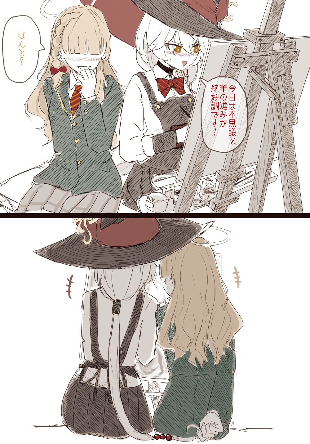 2girls apron black_apron blazer blonde_hair blue_archive blunt_bangs blush bow bowtie commentary_request dress_shirt easel eri_(blue_archive) faceless faceless_female fantomyu flustered halo hat highres holding holding_paintbrush jacket long_hair multiple_girls necktie paintbrush painting_(action) playing_with_another's_hair red_bow red_bowtie shirt translation_request very_long_hair white_hair white_shirt wildhunt_art_academy_student_(ar)_(blue_archive) witch_hat yuri