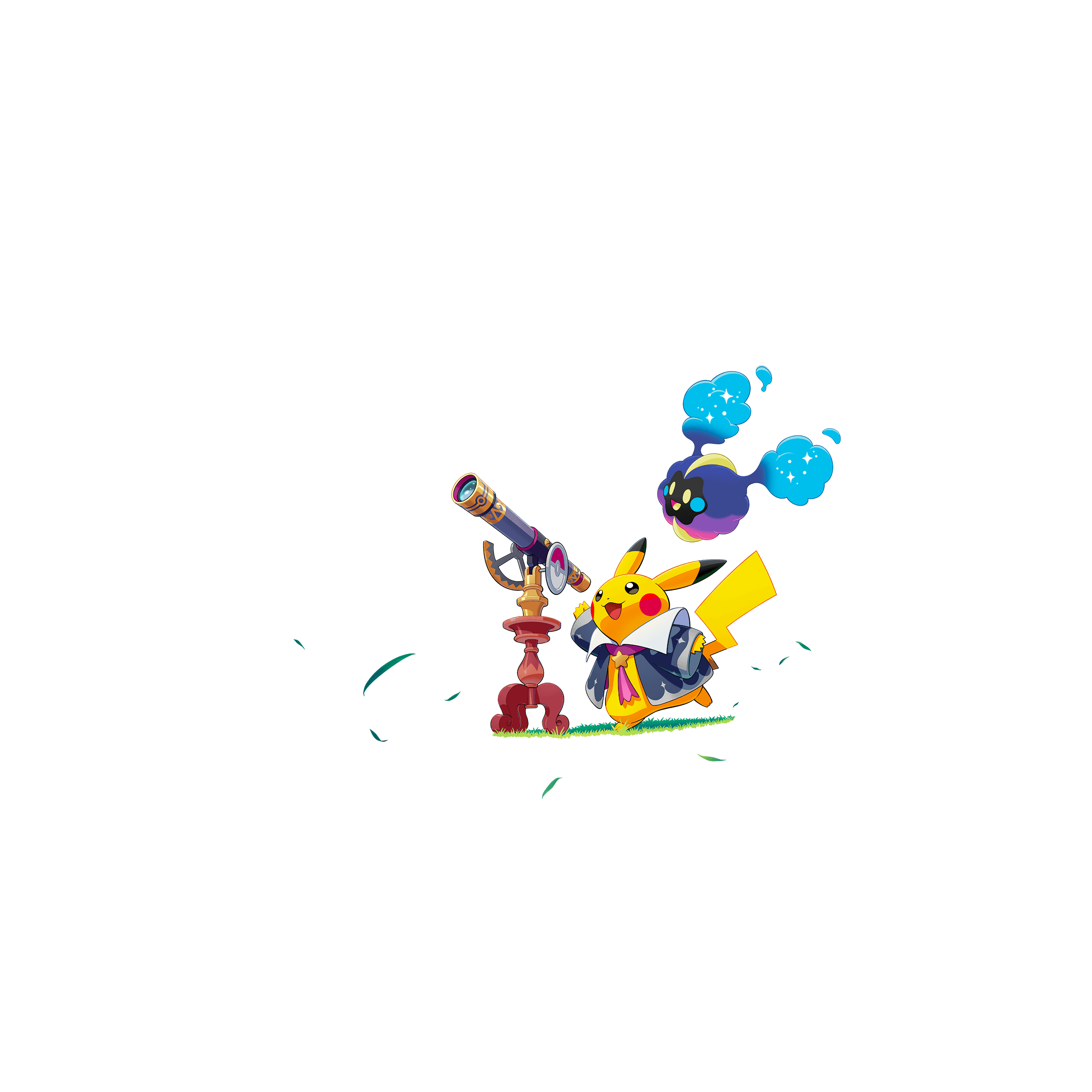 :d artist_request blue_jacket clothed_pokemon cosmog full_body gen_1_pokemon gen_7_pokemon grass highres jacket legendary_pokemon long_sleeves nintendo no_humans official_art open_clothes open_jacket open_mouth pikachu poke_ball_theme pokemon pokemon_(creature) pokemon_focus second-party_source smile solid_oval_eyes standing standing_on_one_leg star_(symbol) telescope transparent_background yellow_eyes