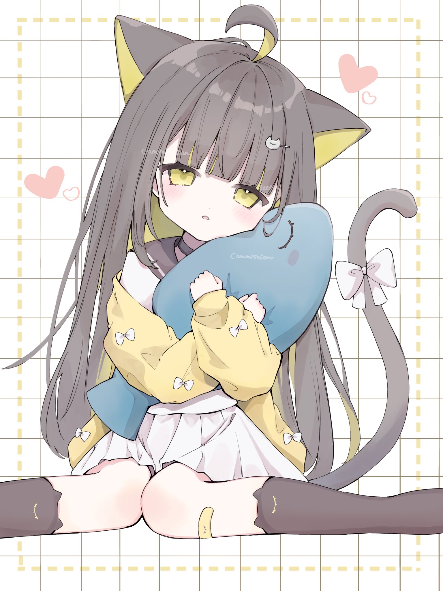 1girl animal_ears bandaid black_choker black_socks bow cat_ears cat_tail character_request choker copyright_request grid_background hair_ornament hairclip heart highres holding holding_stuffed_toy iro_iro_iroo long_hair multicolored_hair open_mouth shirt skirt socks stuffed_toy tail tail_bow tail_ornament two-tone_hair white_bow white_skirt yellow_eyes yellow_shirt