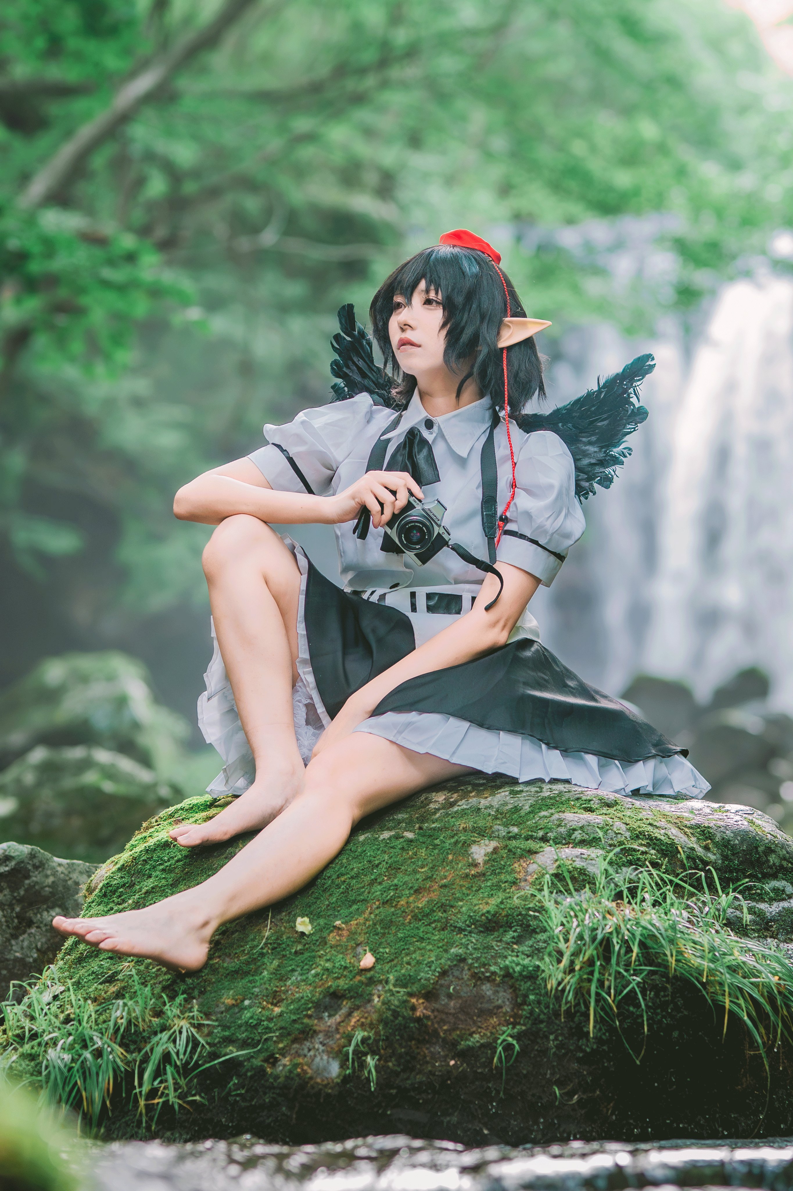absurdres barefoot camera cosplay highres photo_(medium) real_life shameimaru_aya shameimaru_aya_(cosplay) snyan_cos tagme thick_thighs thighs touhou