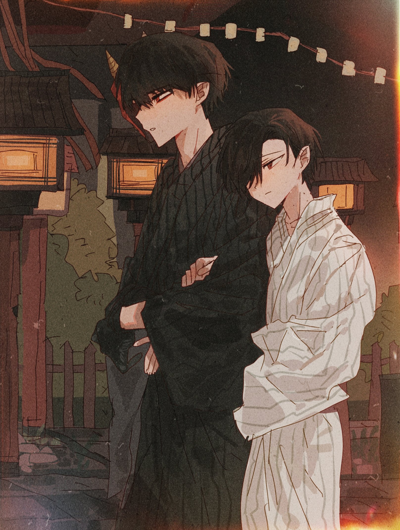 2boys ariake_(ooe) black_hair black_kimono crossed_arms hair_over_one_eye highres horns japanese_clothes kimono long_sleeves male_focus multiple_boys night ooe_(game) oosaki_(ooe) outdoors pointy_ears red_eyes short_hair single_horn standing striped_clothes striped_kimono white_kimono yigemoming2333 yukata