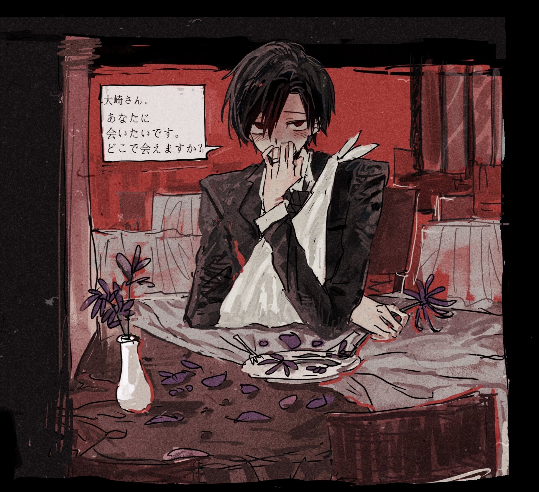 1boy ariake_(ooe) black_hair black_jacket black_suit blush bow bowtie flower fork formal_clothes highres holding holding_knife jacket jewelry knife long_sleeves looking_at_viewer male_focus ooe_(game) petals plate purple_flower red_eyes ring shirt short_hair solo speech_bubble suit table tablecloth vase white_shirt yigemoming2333