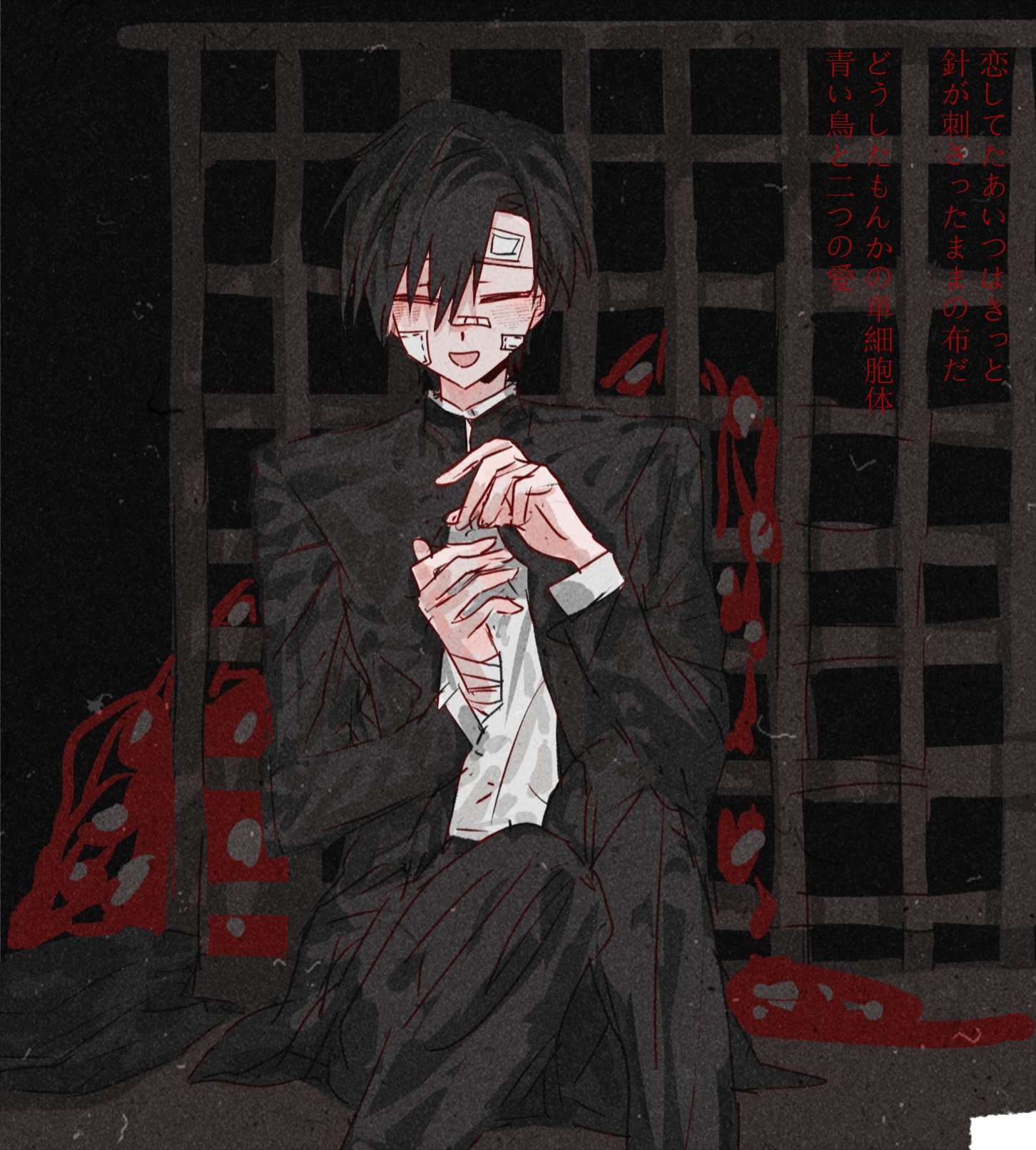 1boy ariake_(ooe) bandage_on_face bandaged_fingers bandages bandaid bandaid_on_face bandaid_on_hand black_hair black_jacket black_pants blood closed_eyes facing_viewer feet_out_of_frame gakuran highres jacket long_sleeves male_focus ooe_(game) open_clothes open_mouth pants school_uniform shirt short_hair sitting smile solo tentacles white_shirt yigemoming2333
