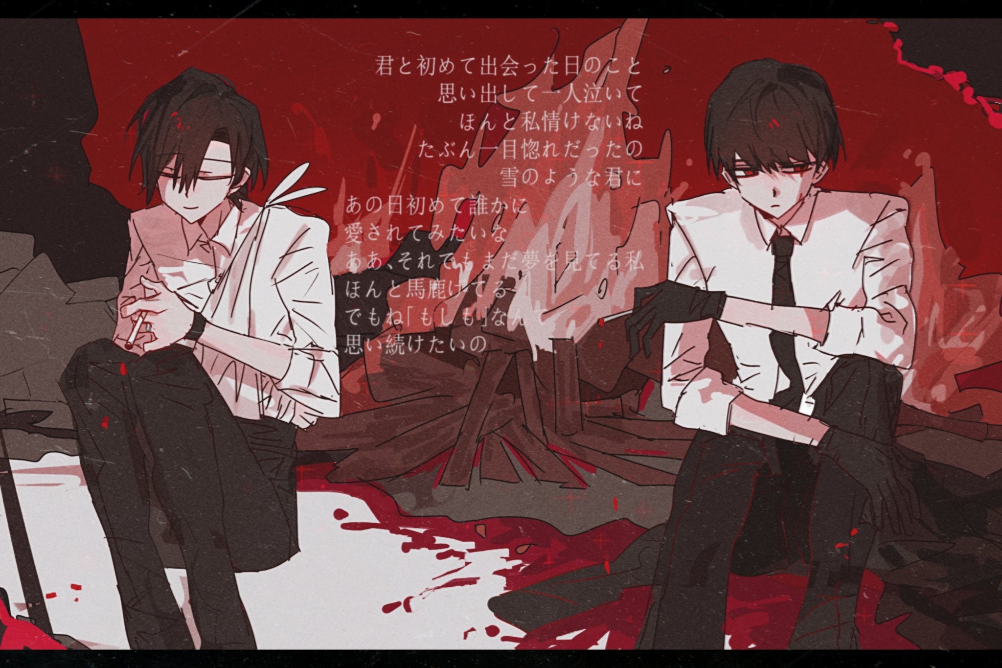 2boys ariake_(ooe) black_gloves black_hair black_necktie black_pants blood closed_eyes collared_shirt gloves highres male_focus multiple_boys necktie ooe_(game) oosaki_(ooe) pants red_eyes shirt short_hair sitting white_shirt yigemoming2333