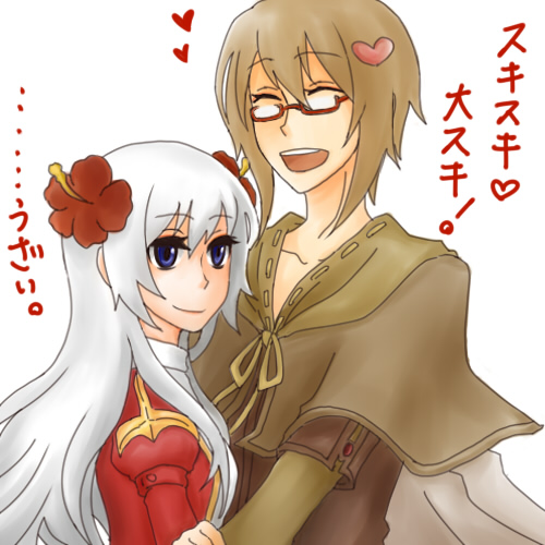 1boy 1girl bard_(ragnarok_online) blue_eyes brown_cape brown_hair brown_shirt cape closed_eyes closed_mouth commentary_request dress flower glasses hair_flower hair_ornament heart heart_hair_ornament high_priest_(ragnarok_online) juliet_sleeves layered_sleeves long_hair long_sleeves looking_at_viewer lowres open_mouth puffy_sleeves ragnarok_online red-framed_eyewear red_dress red_flower robert_(pixiv194826) shirt short_hair short_over_long_sleeves short_sleeves simple_background smile translation_request upper_body white_background white_hair