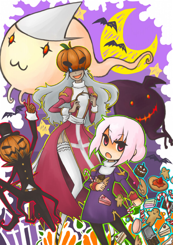 1other 2girls black_pants black_pantyhose cake cake_slice candy candy_cane commentary_request cookie cowboy_shot crescent_moon dress food garter_straps ghost gingerbread_man halloween high_priest_(ragnarok_online) jack-o'-lantern jack-o'-lantern_head jakk_(ragnarok_online) juliet_sleeves long_hair long_sleeves looking_at_viewer lude_(ragnarok_online) moon multiple_girls open_mouth pants pantyhose pink_hair priest_(ragnarok_online) puffy_sleeves pumpkin_on_head purple_dress purple_sky quve_(ragnarok_online) ragnarok_online red_dress red_eyes robert_(pixiv194826) sash short_hair sky smile thighhighs two-tone_dress white_dress white_sash white_thighhighs wrapped_candy