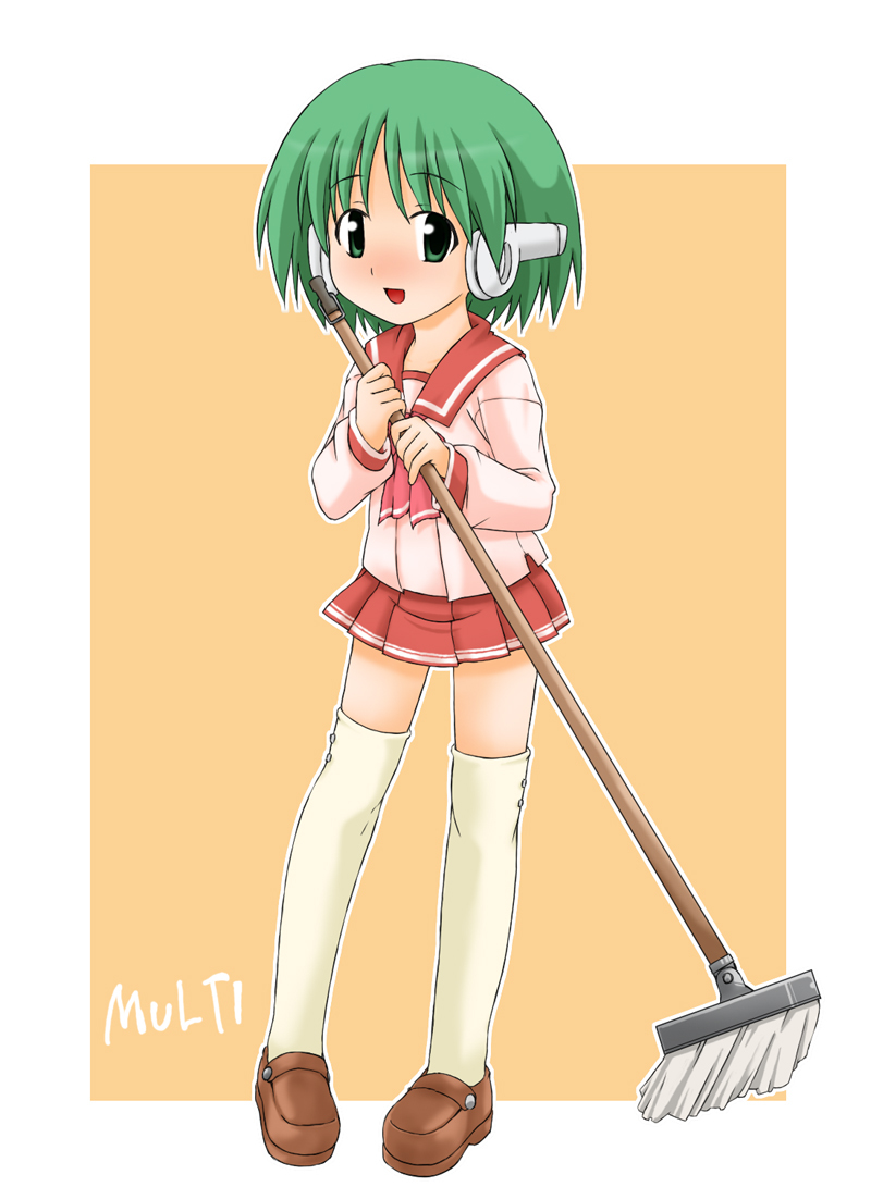 1girl character_name dot_nose female_focus full_body green_eyes green_hair holding holding_mop long_sleeves looking_at_viewer mop multi_(to_heart) open_mouth orange_background red_sailor_collar red_skirt robot_ears robot_girl sailor_collar shirt shoes simple_background skirt solo standing thighhighs to_heart to_heart_(series) white_shirt