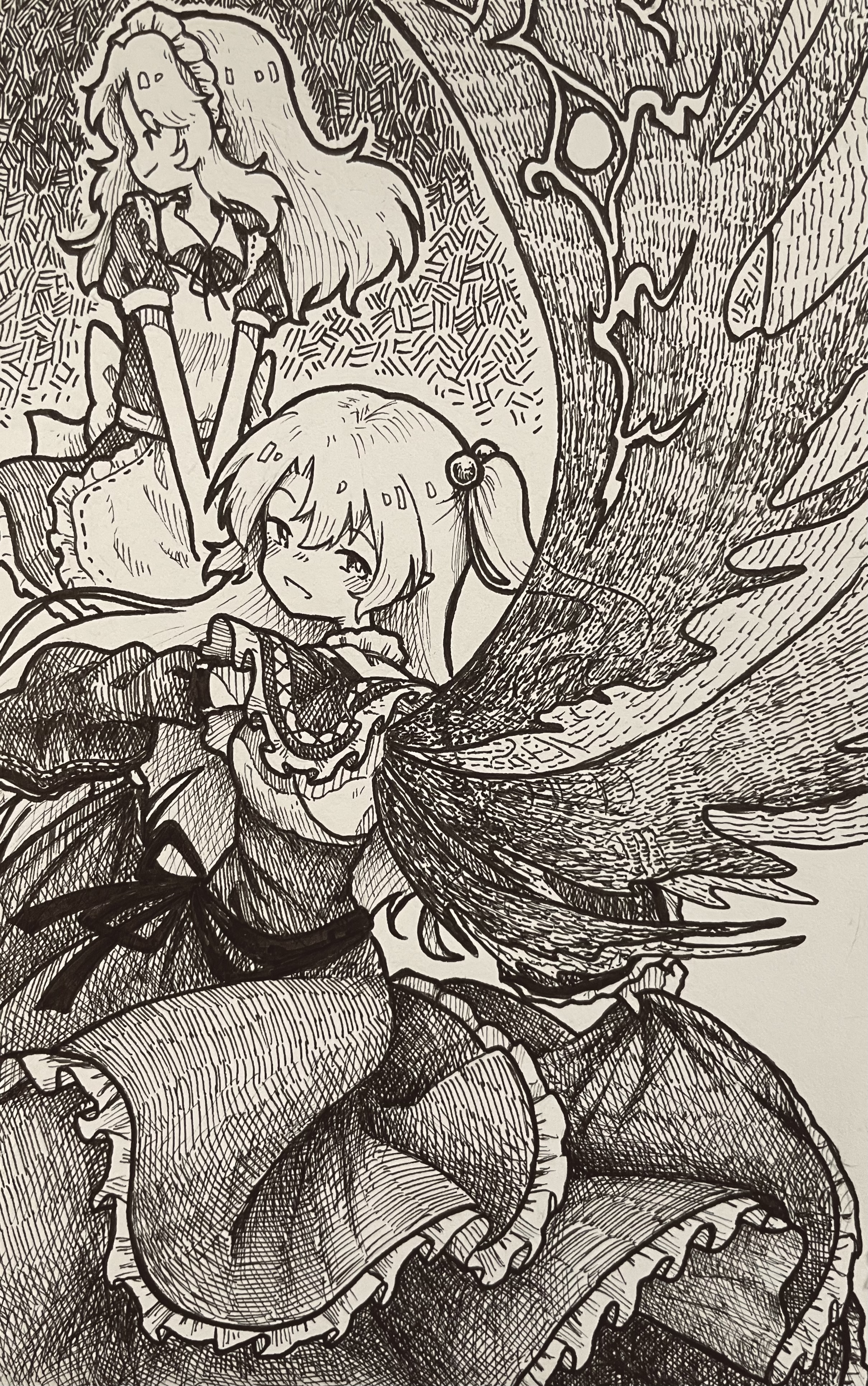 2girls absurdres apron capelet commentary_request greyscale hair_bobbles hair_ornament highres holding_own_dress long_hair long_sleeves looking_at_viewer maid maid_apron maid_headdress monochrome multiple_girls multiple_wings one_side_up open_mouth puffy_short_sleeves puffy_sleeves shinki_(touhou) short_sleeves smile suteruko touhou touhou_(pc-98) traditional_media very_long_hair wide_sleeves wings yumeko_(touhou)