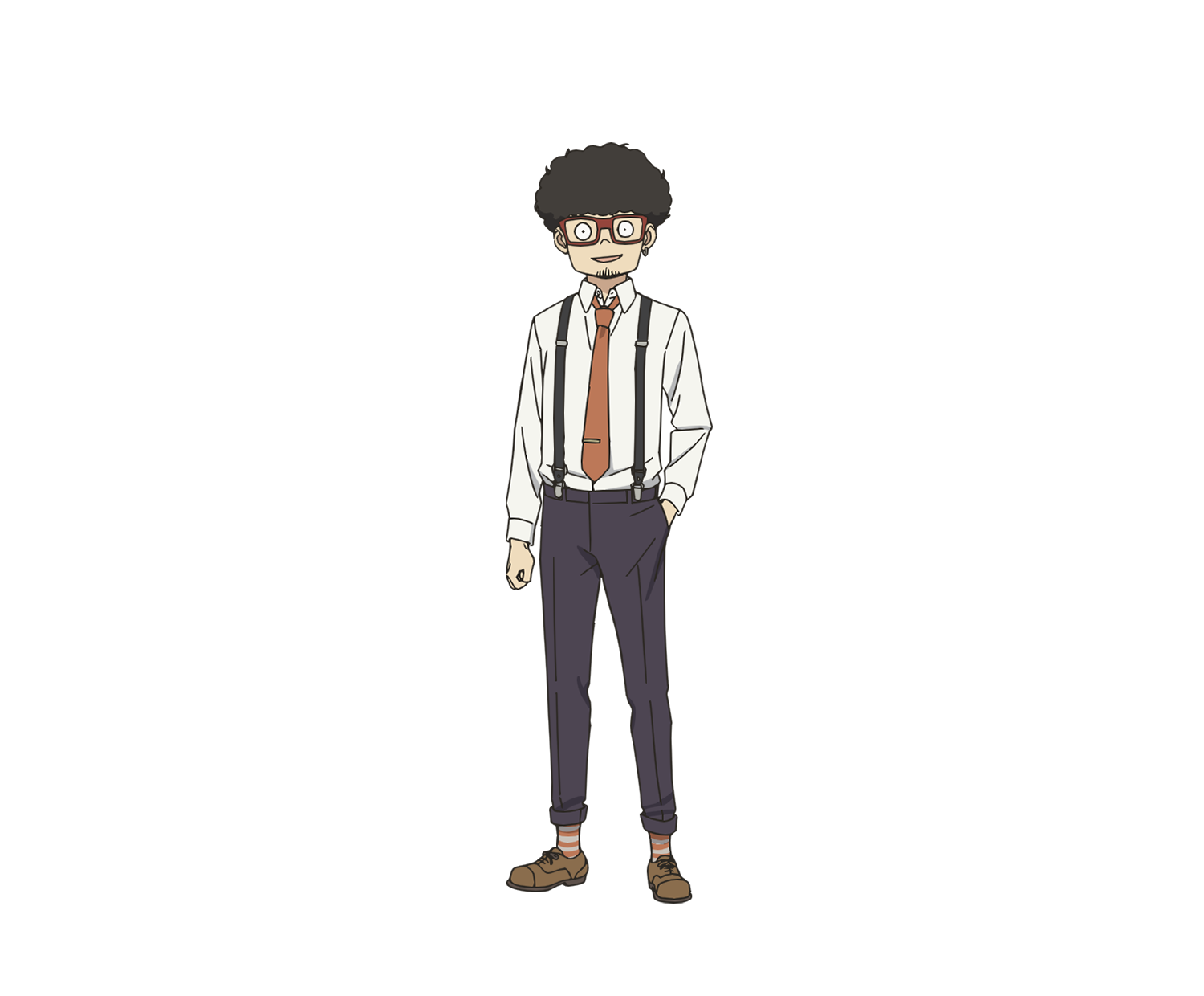 1boy afro anime_coloring beard black_eyes black_hair black_pants brown_necktie brown_shoes clenched_hand collared_shirt earrings facial_hair franky_franklin full_body glasses hand_in_pocket highres jewelry long_sleeves looking_at_viewer necktie official_art open_mouth orange_socks pants pants_rolled_up red-framed_eyewear shimada_kazuaki shirt shoes short_hair simple_background smile socks solo spy_x_family standing striped_clothes striped_socks stubble suspenders tachi-e transparent_background two-tone_socks white_shirt