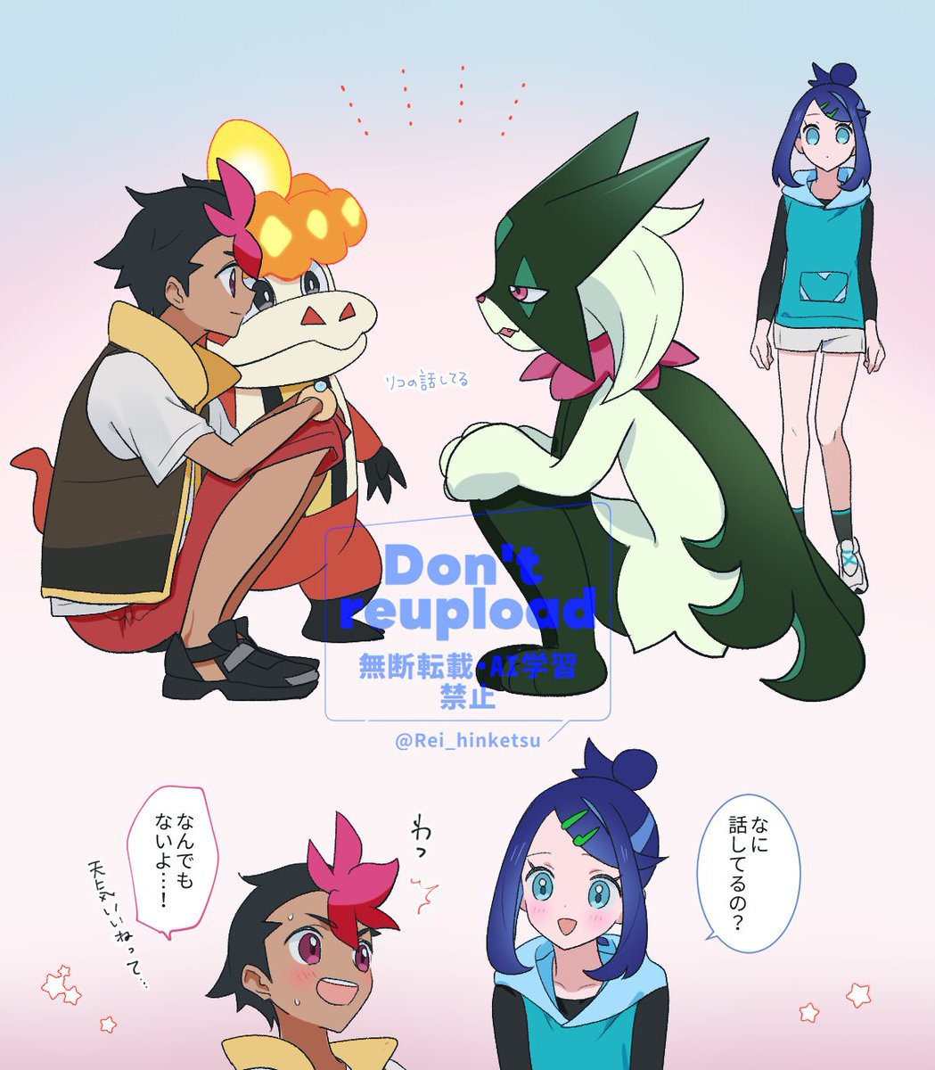 1boy 1girl black_hair black_shirt black_shoes bracelet brown_vest capri_pants commentary_request crocalor hair_bun hair_ornament hairclip highres hood hooded_vest hoodie jewelry knees liko_(pokemon) meowscarada multicolored_hair nintendo pants pink_hair pokemon pokemon_(anime) pokemon_(creature) pokemon_horizons red_pants rei_hinketsu roy_(pokemon) shirt shoes short_hair short_sleeves shorts sidelocks socks squatting swept_bangs twitter_username two-tone_hair vest watermark white_shirt