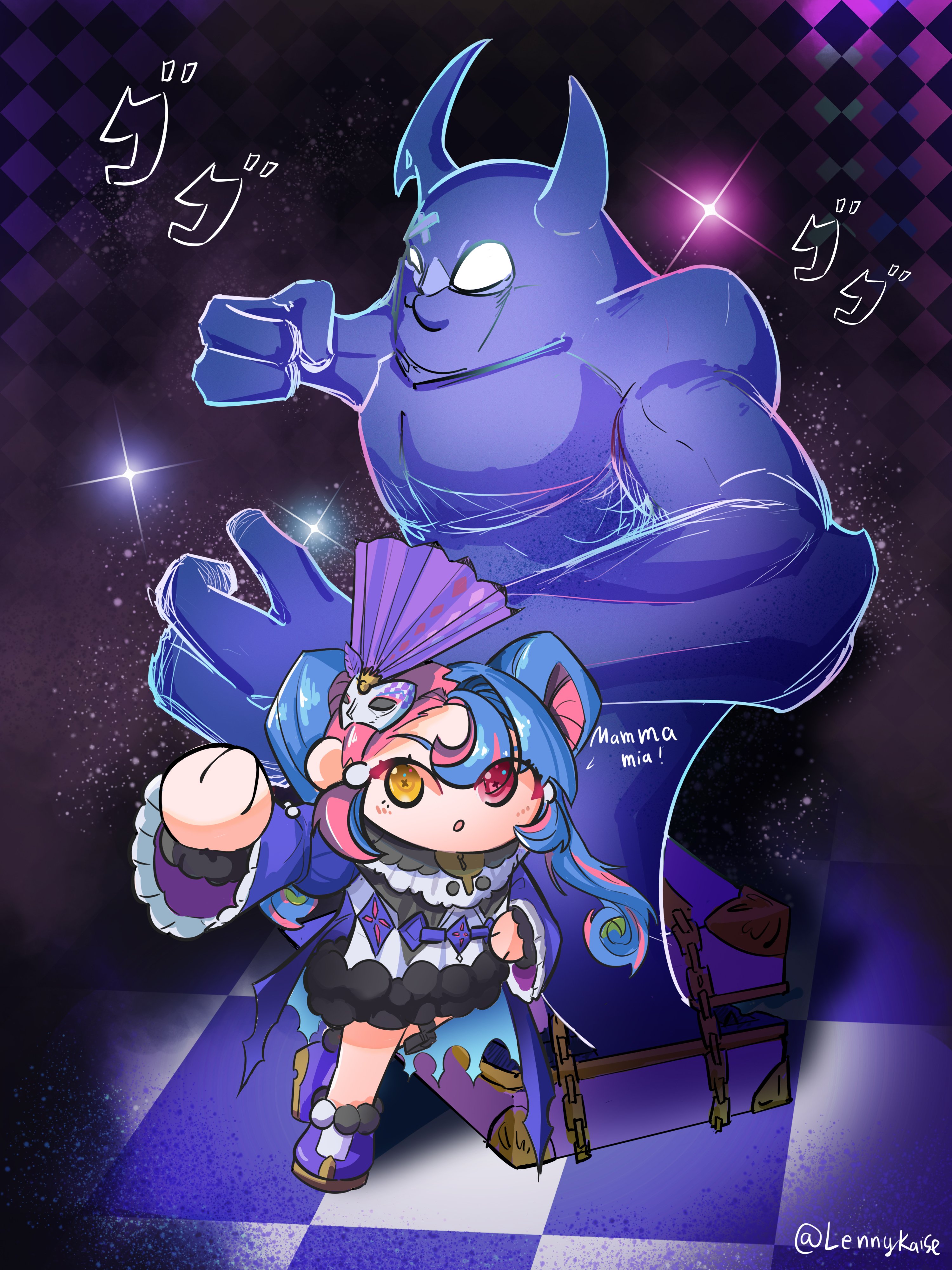 1girl absurdres arm_up blue_hair checkered_floor coat commentary dress english_commentary fur-trimmed_dress fur_trim heterochromia highres jojo_no_kimyou_na_bouken lennykaise long_hair menacing_(jojo) multicolored_hair pero_(wuthering_waves) pink_eyes pink_hair purple_coat roccia_(wuthering_waves) twintails twitter_username two-tone_hair white_dress wuthering_waves yellow_eyes