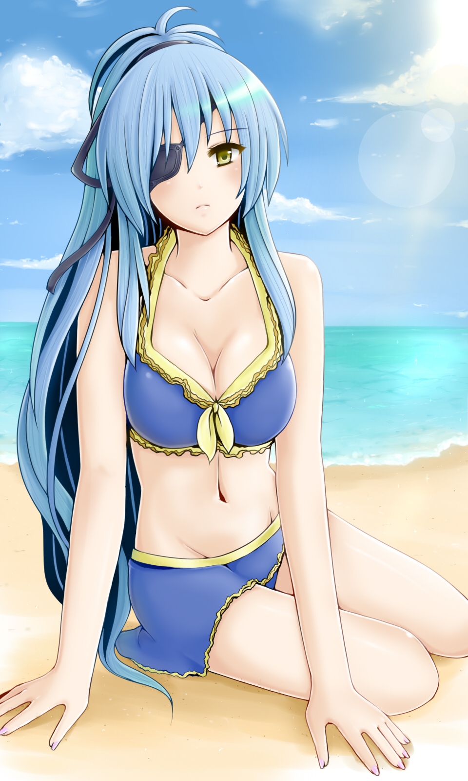 10s 1girl bad_id bad_pixiv_id beach bikini bikini_skirt blue_hair blush breasts cloud collarbone date_masamune_(sengoku_otome) day eyepatch female_focus gradient_background halterneck highres lens_flare long_hair medium_breasts mizuki_miyu navel outdoors sengoku_otome sky solo swimsuit very_long_hair yellow_eyes
