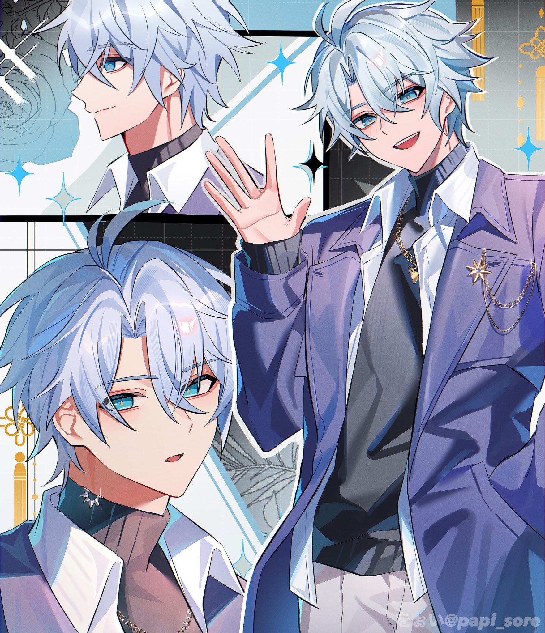 &{ID:12546427 CreatedAt:Sat Aug 30 10:00:34 -0500 2025 Score:0 Width:1762 Height:2048 MD5:f1c53a84f1aabdc4541cb0849078a918 Directory:f1/c5 Image:f1c53a84f1aabdc4541cb0849078a918.jpg Rating:general Source:https://twitter.com/papi_sore/status/1961730614148915641 Change:1756566035 Owner:danbooru CreatorID:6498 ParentID:0 Sample:1 PreviewHeight:350 PreviewWidth:301 Tags:1boy antenna_hair black_sweater blue_coat blue_eyes closed_mouth coat crossed_bangs gold_necklace grey_hair hair_between_eyes hand_up highres honkai:_star_rail honkai_(series) jewelry looking_at_viewer male_focus multiple_views necklace official_alternate_costume open_clothes open_coat open_mouth open_shirt papi_sore parted_bangs phainon_(honkai:_star_rail) phainon_(luckin_coffee)_(honkai:_star_rail) profile shirt short_hair smile solo sweater teeth turtleneck turtleneck_sweater upper_body upper_teeth_only waving white_shirt yellow_pupils Title: HasNotes:false HasComments:false FileURL:https://img2.gelbooru.com/images/f1/c5/f1c53a84f1aabdc4541cb0849078a918.jpg PreviewURL:https://gelbooru.com/thumbnails/f1/c5/thumbnail_f1c53a84f1aabdc4541cb0849078a918.jpg SampleURL:https://img2.gelbooru.com/samples/f1/c5/sample_f1c53a84f1aabdc4541cb0849078a918.jpg SampleHeight:988 SampleWidth:850 Status:active PostLocked:0 HasChildren:false IsVideo:false DisplayDate:30.08.2025 10:00}