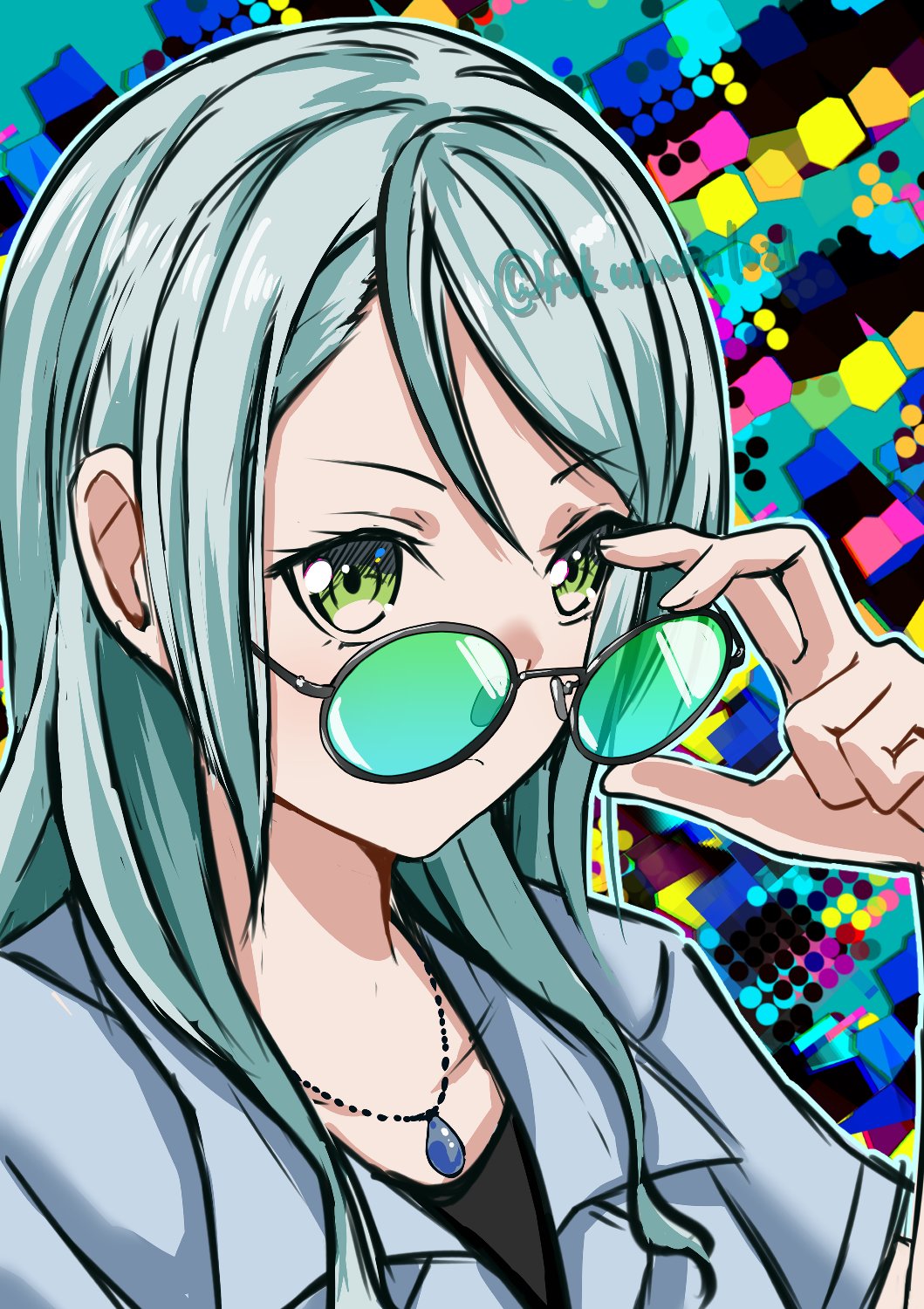 1girl bang_dream! bang_dream!_girls_band_party! black_shirt blue_jacket collar fukumaru1021 glasses green_eyes green_hair highres hikawa_sayo jacket jewelry long_hair looking_at_viewer shirt sleeveless solo twitter_username upper_body