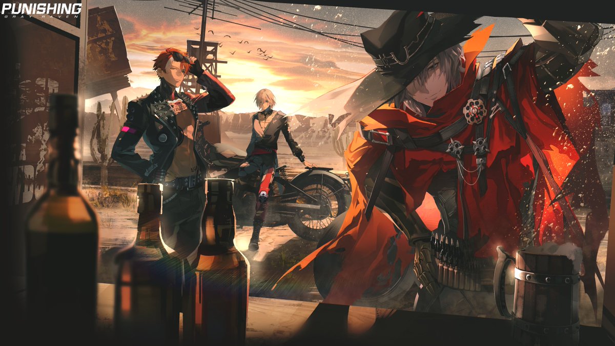 3boys adjusting_eyewear arm_up beer_mug belt_buckle black_gloves black_hat black_jacket black_pants black_skirt blurry buckle bullet chest_tattoo cloak cloud commentary copyright_name cup depth_of_field english_commentary eyewear_on_head fingerless_gloves flock glass_bottle gloves grey_eyes grey_hair hand_on_own_hip hat jacket leaning_back leaning_on_object light_rays long_sleeves looking_at_viewer mechanical_arms mechanical_legs motor_vehicle motorcycle mountain mug multiple_boys noctis:_indomitus_(pgr) noctis:_indomitus_(punk_dynamo)_(pgr) noctis_(pgr) official_art outdoors pants punishing:_gray_raven red_cloak red_hair roland:_flambeau_(pgr) roland_(pgr) shirt short_hair skirt smile spiked_jacket standing sunbeam sunglasses sunlight tattoo torn_cloak torn_clothes two-tone_shirt watanabe:_epitaph_(hell_sing)_(pgr) watanabe:_epitaph_(pgr) watanabe_(pgr) white_shirt yellow_eyes