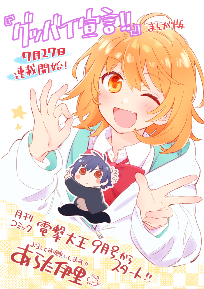 1boy 1girl ;d ahoge arata_iri artist_name black_jacket black_pants blue_hair blush_stickers brown_sweater closed_mouth collared_shirt commentary_request dress_shirt fang goodbye_sengen_(vocaloid) jacket kiritani_kakeru looking_at_viewer nanase_rena_(arusechika) ok_sign one_eye_closed open_clothes open_jacket open_mouth orange_eyes orange_hair pants shirt short_hair smile sweater v v-shaped_eyebrows white_jacket white_shirt