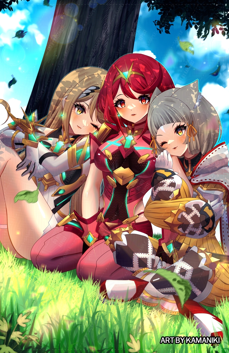 3girls breasts chest_jewel headpiece highres kamaniki large_breasts multiple_girls mythra_(xenoblade) nia_(xenoblade) pyra_(xenoblade) red_hair swept_bangs tiara xenoblade_chronicles_(series) xenoblade_chronicles_2