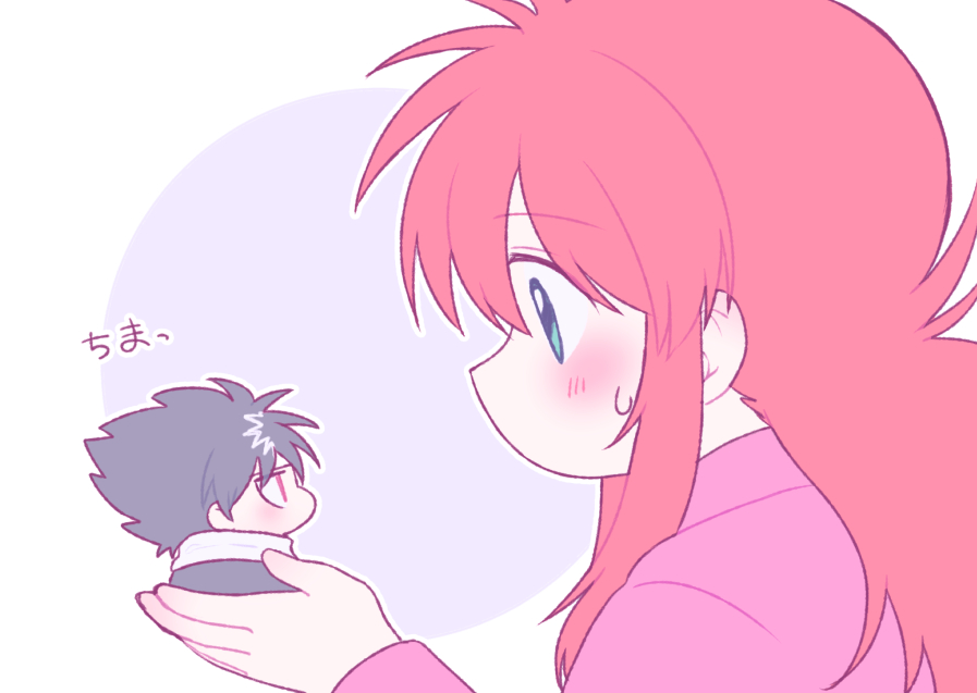 2boys black_hair blue_eyes blush chibi commentary_request from_side gakuran hands_up hiei_(yu_yu_hakusho) holding holding_mini_person jacket kurama_(yu_yu_hakusho) long_hair looking_at_another male_focus mini_person miniboy morishi_(bearxforest) multiple_boys outline pink_jacket purple_background red_eyes red_hair school_uniform short_hair sidelocks simple_background spiked_hair translation_request upper_body white_outline yuu_yuu_hakusho