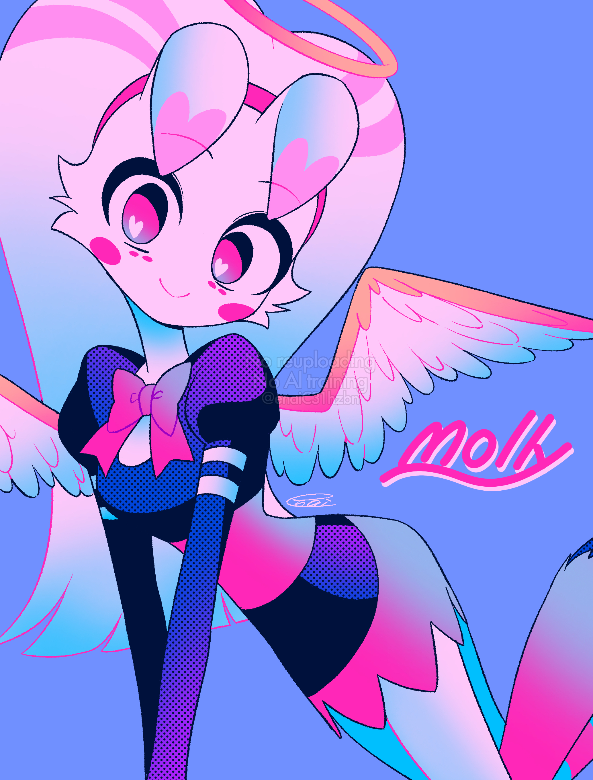1girl absurdres black_dress blue_background bow bowtie breasts character_name chromatic_aberration circle_facial_mark closed_mouth commentary_request dress extra_legs facial_mark feathered_wings feet_out_of_frame film_grain frilled_dress frills hairband halftone halo hazbin_hotel heart heart_in_eye hellaverse highres hooves horns jumping long_sleeves looking_at_viewer menma_(enaic31) molly_(hazbin_hotel) no_pupils pink_bow pink_bowtie pink_eyes pink_hairband short_dress signature simple_background small_breasts smile solo symbol_in_eye two-tone_wings v_arms watermark white_fur white_wings wings yellow_halo yellow_wings