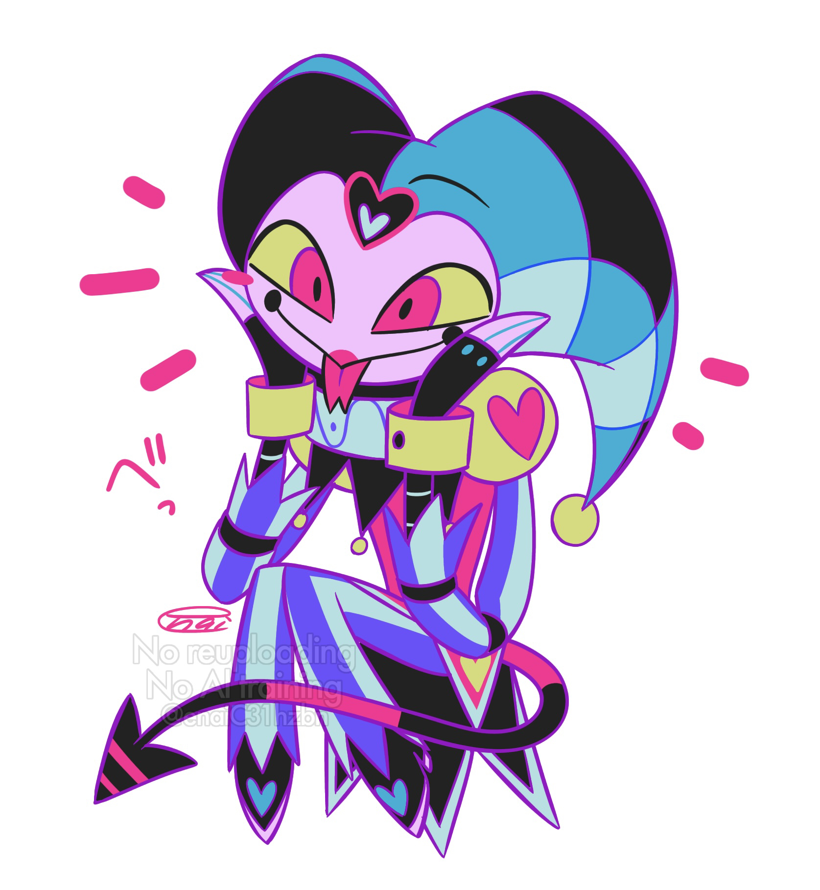 1boy aqua_hat black_boots black_hat black_tail blush_stickers boots circle_facial_mark closed_mouth colored_sclera colored_skin commentary_request deformed demon_tail facial_mark fewer_digits fizzarolli_(helluva_boss) forked_tongue full_body grey_pants hands_on_own_cheeks hands_on_own_face hat hat_bell heart heart_print hellaverse helluva_boss high_heel_boots high_heels highres invisible_chair jester jester_cap juliet_sleeves long_sleeves male_focus mechanical_arms menma_(enaic31) neck_ruff pants puffy_sleeves purple_pants red_eyes red_shirt red_tail shirt signature simple_background single_blush_sticker sitting smile solo striped_clothes striped_pants tail tongue tongue_out two-tone_pants two-tone_tail vertical-striped_clothes vertical-striped_pants watermark white_background white_skin yellow_sclera