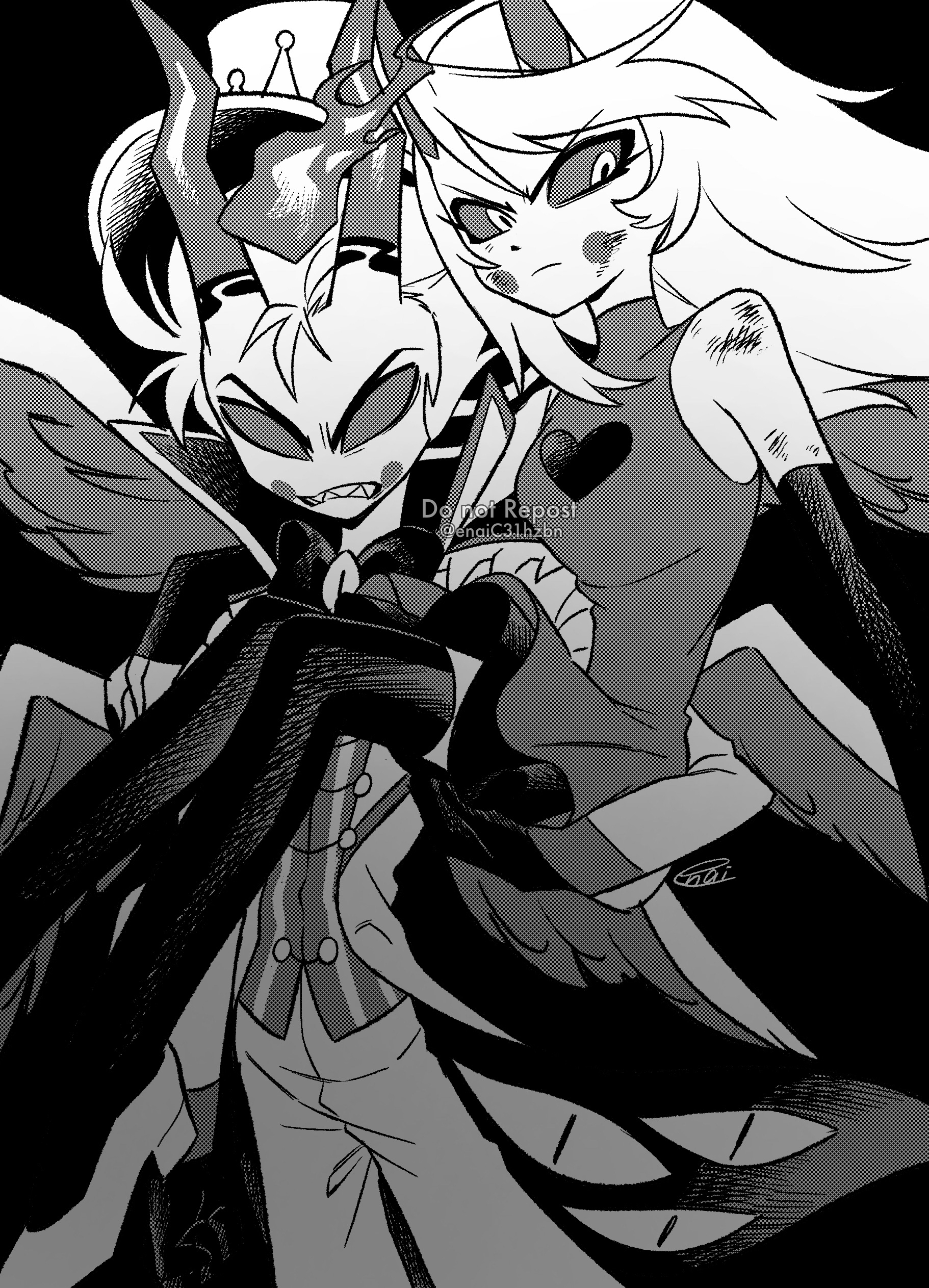 1boy 1girl absurdres angry bare_shoulders black_background boots bow bowtie breasts buttons carrying carrying_person charlie_morningstar circle_facial_mark clenched_teeth closed_mouth coat colored_sclera commentary_request cowboy_shot demon_boy demon_girl demon_horns dress elbow_gloves extra_eyes facial_mark father_and_child father_and_daughter feathered_wings fire foot_out_of_frame frown gloves greyscale halftone hand_on_another's_shoulder hat hatching_(texture) hazbin_hotel heart heart_print hellaverse high_contrast highres horns long_hair long_sleeves looking_at_viewer lucifer_morningstar_(hazbin_hotel) menma_(enaic31) monochrome multiple_wings nail_polish open_clothes open_coat pants parent_and_child shirt short_dress short_hair signature simple_background sleeveless sleeveless_dress sleeveless_turtleneck small_breasts standing striped_clothes striped_shirt swept_bangs teeth thigh_boots thighhighs top_hat traditional_bowtie turtleneck turtleneck_dress v-shaped_eyebrows vertical-striped_clothes vertical-striped_shirt very_long_hair wings zettai_ryouiki
