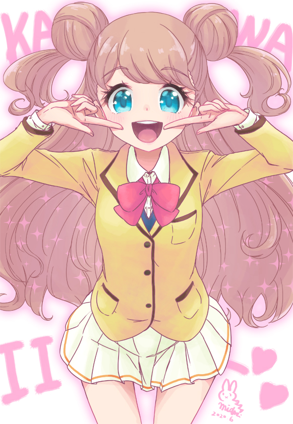 1girl :d blazer blue_eyes blush breast_pocket brown_hair collared_shirt commentary cowboy_shot double_bun dress_shirt fingers_to_cheeks hair_bun heart jacket kanamori_maria kiratto_pri_chan long_hair looking_at_viewer miniskirt mizuki_maya open_mouth outer_glow pleated_skirt pocket pretty_series school_uniform shirt signature skirt smile solo standing straight-on two_side_up very_long_hair white_shirt white_skirt yellow_jacket