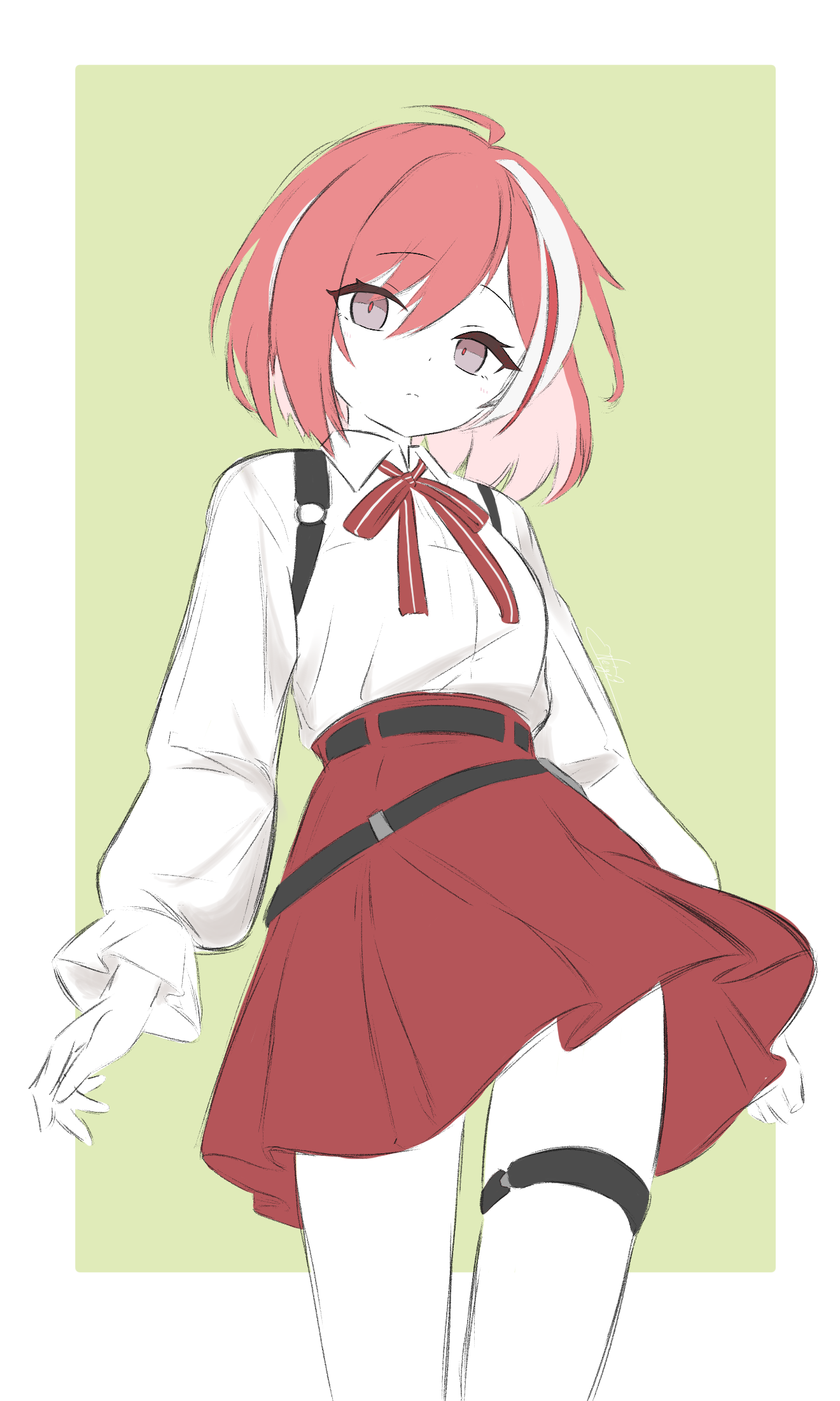 1girl ahoge belt eika_(strinova) green_background hair_between_eyes harness highres looking_at_viewer multicolored_hair noire_neige pale_skin red_eyes red_hair ribbon short_hair simple_background skirt solo standing strinova thigh_strap thighs white_hair wind