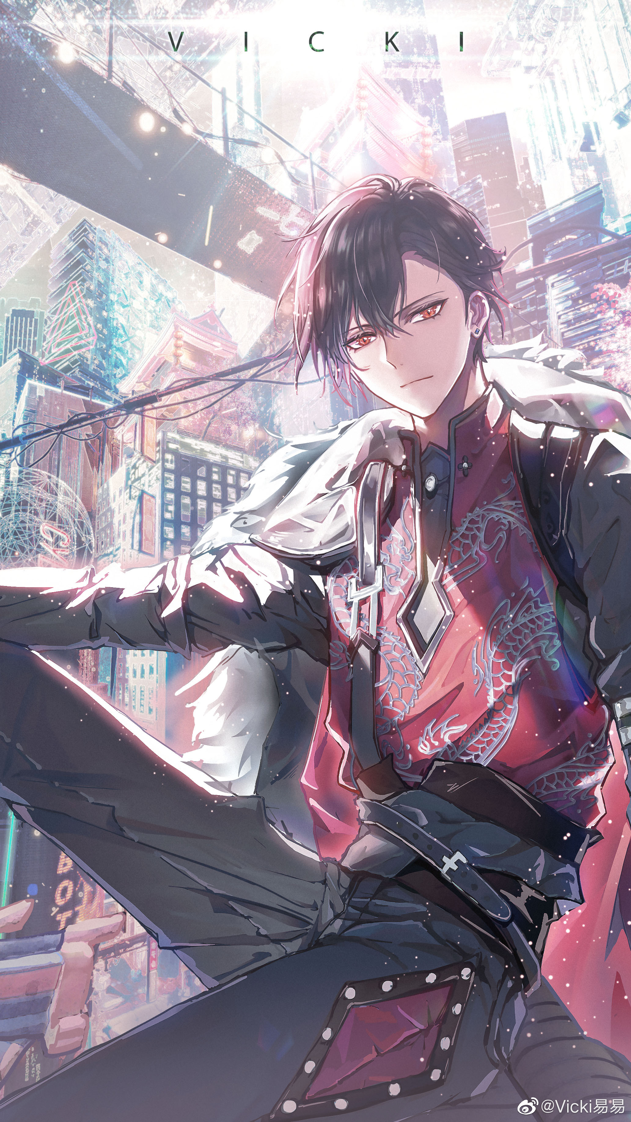 1boy absurdres architecture arm_on_knee arm_support artist_name ayn_alwyn ayn_alwyn_(awakening) belt black_belt black_coat black_hair black_pants black_shirt bridge building cherry_blossoms chinese_commentary cityscape closed_mouth coat coat_on_shoulders cowboy_shot diamond-shaped_earrings diamond_(shape) dragon_print earrings east_asian_architecture expressionless flower fur-trimmed_coat fur_trim hair_behind_ear hair_between_eyes highres jewelry knee_up light_particles long_sleeves looking_at_viewer lovebrush_chronicles male_focus on_roof pants pink_flower power_lines red_coat red_eyes red_vest science_fiction shirt short_hair sitting skyscraper solo stud_earrings sun tree two-sided_coat two-sided_fabric vest vicki_yiyi watermark weibo_watermark
