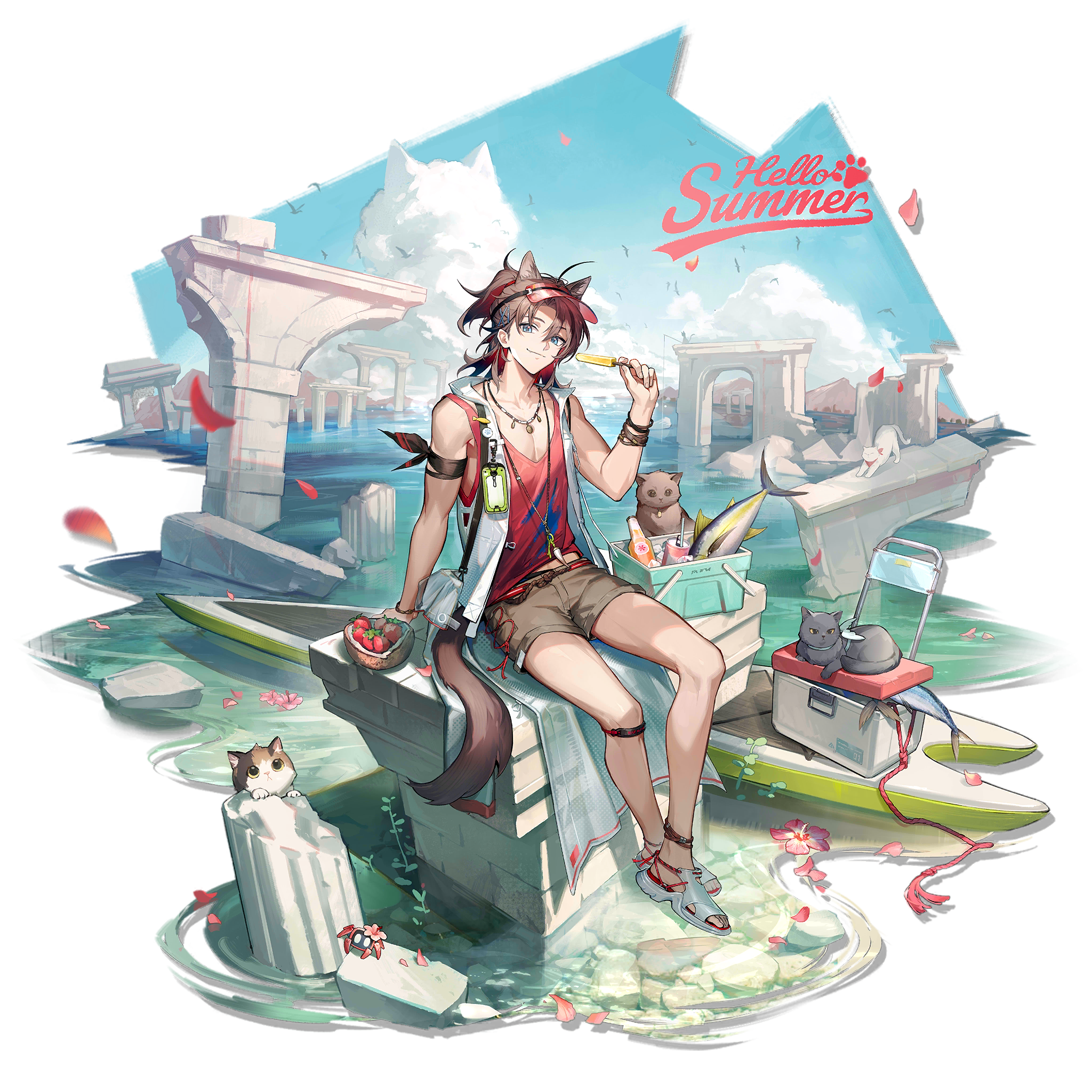 1boy animal animal_ears arknights bishounen blue_eyes brown_cat brown_hair calico_(pattern) calico_cat cat cat_boy cat_ears cat_tail closed_mouth coconut coconut_cup fruit_as_cup full_body grey_cat highres holding kang_yiqian_(self_cultivation) looking_at_viewer male_focus official_art red_tank_top simple_background sitting smile solo stainless_(arknights) stainless_(beach_guard)_(arknights) tail tank_top third-party_source transparent_background visor_cap
