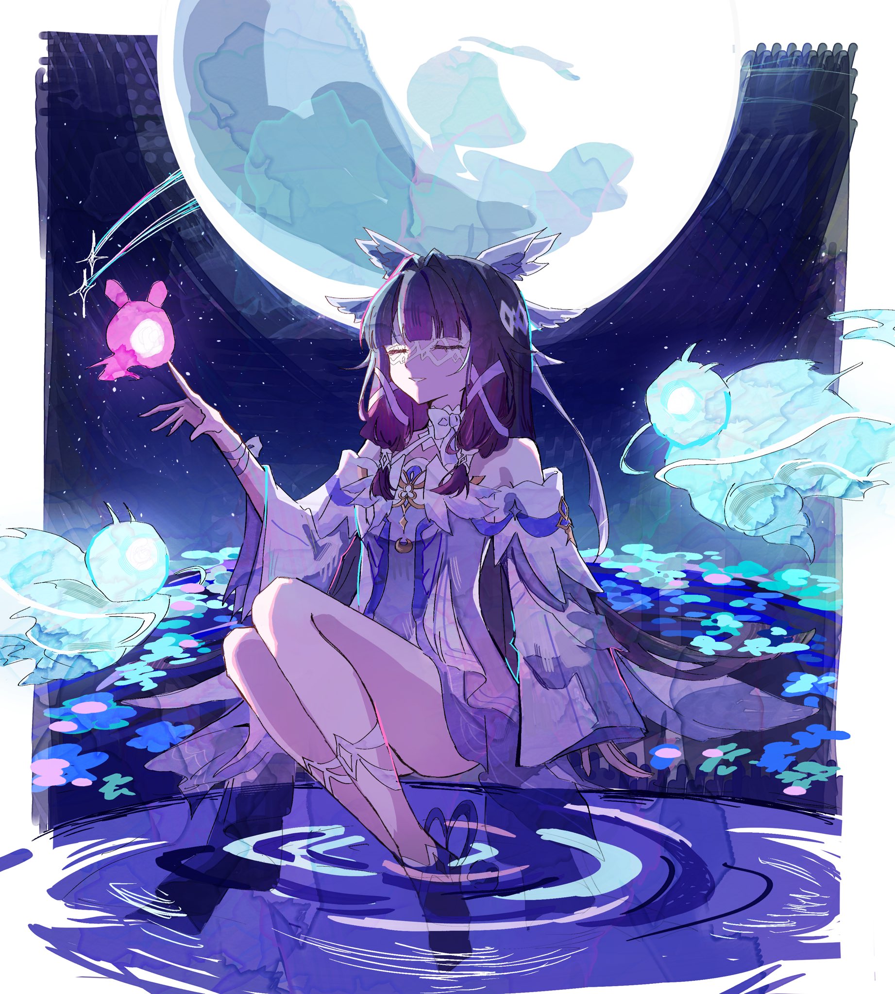 1girl bare_shoulders black_hair bow closed_eyes columbina_(genshin_impact) crescent_moon cutedogggggggg detached_sleeves eye_mask full_moon genshin_impact hair_ornament head_wings highres jewelry long_hair mask moon multicolored_hair night petals reflection ripples seelie_(genshin_impact) sitting sketch sky smile star_(sky) starry_sky streaked_hair wading water white_mask wings x-shaped_eyewear x_hair_ornament