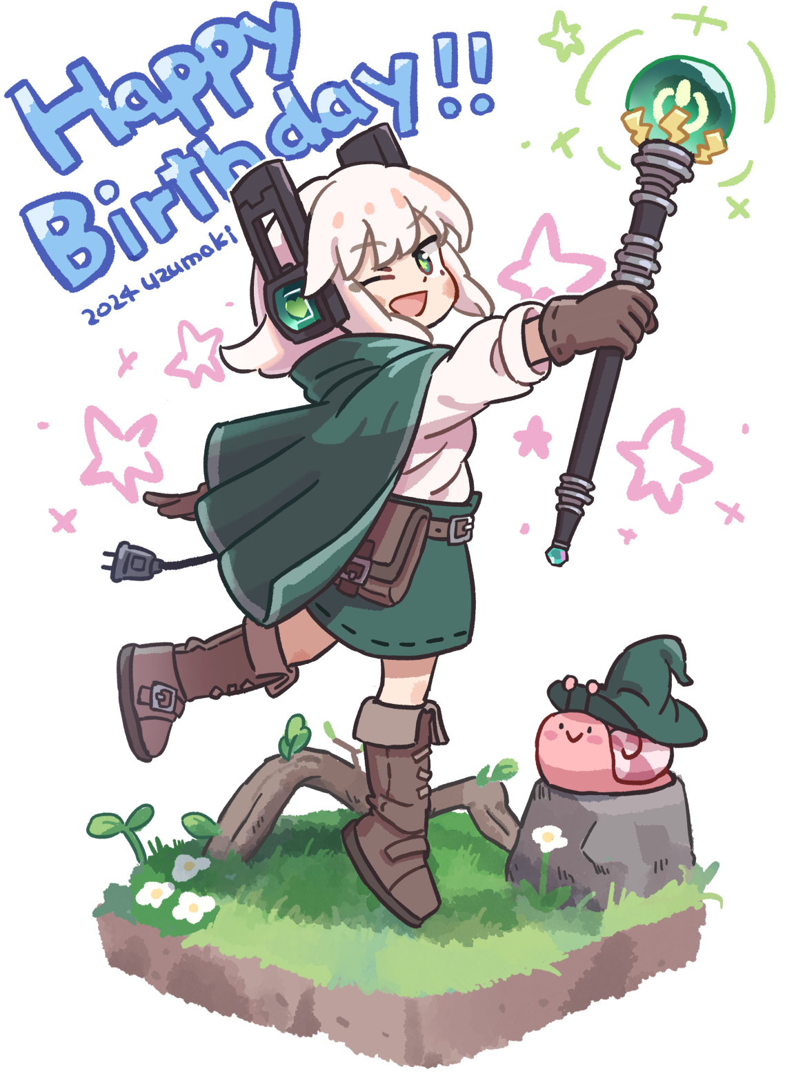 1girl ;d artist_name belt_pouch blush_stickers boots borrowed_character brown_boots brown_gloves candy_snail_(porforever) cape commentary digitan_(porforever) electric_plug electric_plug_tail english_commentary flower full_body gloves grass green_cape green_hat green_skirt happy_birthday hat heart highres holding holding_staff knee_boots long_sleeves looking_at_viewer mini_hat one_eye_closed open_mouth original pouch power_symbol robot_ears shirt simple_background skirt smile solo staff star_(symbol) tail uzumaki_osushi white_background white_hair white_shirt witch_hat