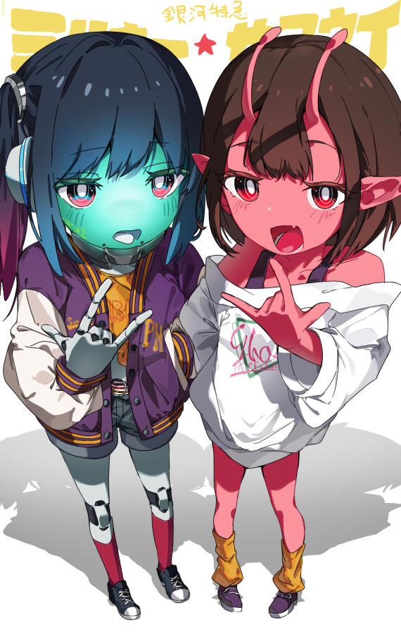 2girls \m/ antennae aqua_skin bare_shoulders black_hair bright_pupils brown_hair colored_skin hand_in_pocket hand_up jacket kannpoyu kujo_chiharu kurusu_makina_(milky_galactic_universe) long_sleeves looking_at_viewer milky_galactic_universe milky_highway multiple_girls off_shoulder open_clothes open_jacket open_mouth purple_jacket red_skin red_socks robot_girl shirt short_shorts shorts socks standing white_pupils white_shirt yellow_socks
