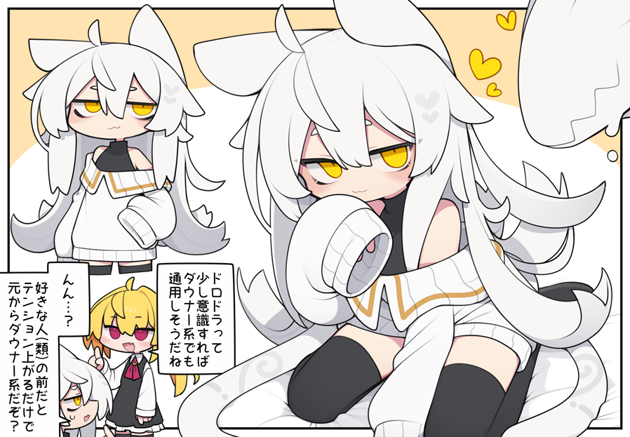 2girls :3 ahoge bare_shoulders black_dress black_shirt black_thighhighs blonde_hair closed_mouth commentary_request creature dorodra_(kisaragi_kaya) dress flipped_hair hair_flaps hand_up heart kisaragi_kaya long_hair long_sleeves multiple_girls multiple_views no_shoes off-shoulder_sweater off_shoulder open_mouth original otogi_hime_(kisaragi_kaya) pink_eyes puffy_long_sleeves puffy_sleeves shirt sleeveless sleeveless_shirt sleeves_past_wrists smile speech_bubble sweater thighhighs translation_request turtleneck turtleneck_shirt white_hair white_sweater yellow_eyes