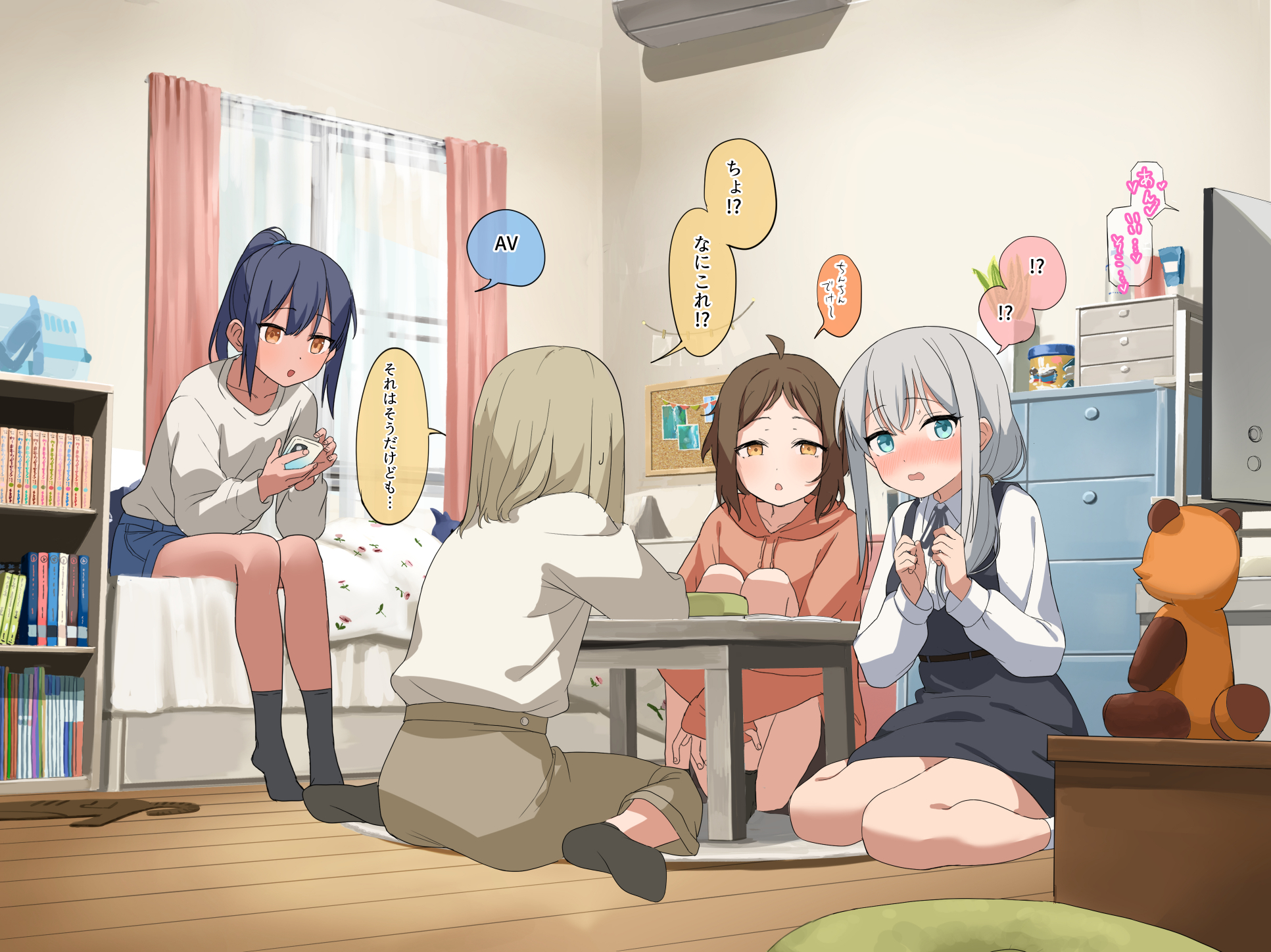 4girls breasts brown_hair commentary_request curtains grey_hair highres indoors large_variant_set lemontyoisy_r18 multiple_girls original paid_reward_available sitting small_breasts speech_bubble stuffed_toy translation_request variant_set