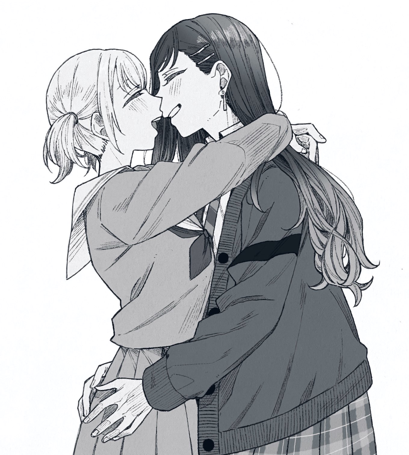 2girls arms_around_neck azusawa_kohane blush cardigan closed_eyes commentary earrings greyscale highres jewelry long_hair monochrome multiple_girls mygod55555 neckerchief open_mouth pleated_skirt project_sekai sailor_collar school_uniform serafuku shiraishi_an skirt smile untranslatable_commentary twintails yuri